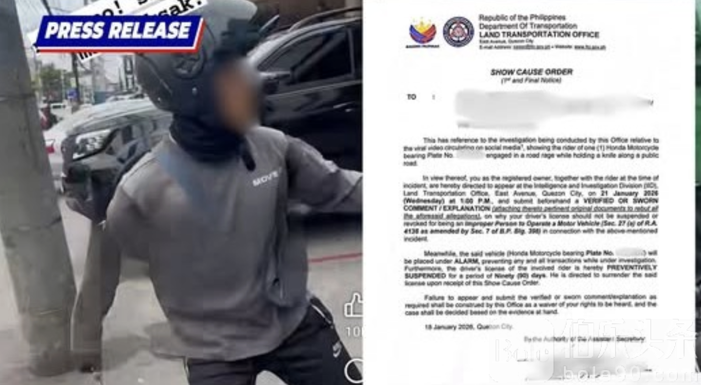 伯乐头条专讯:菲律宾陆路交通管理局近日对一宗引发全国关注的路怒事件作出强硬回应,一名摩托车骑士因在道路纠纷中当街持刀威胁他人,相关画面在社交媒体疯传后,被官方紧急吊销驾驶执照90天,并列入重点监控名单。