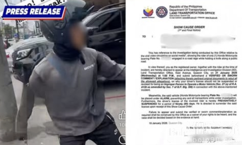 除了涉事骑士本人,陆路交通管理局也同步传唤摩托车登记车主,要求两人于1月21日前往奎松市交通管理局情报与调查部门,提交书面说明及宣誓解释文件。官方表示,若调查发现存在其他违法行为,不排除追加处罚。