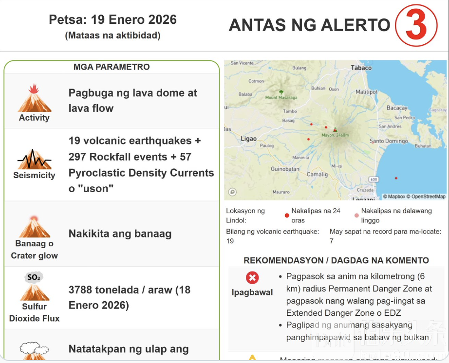 伯乐头条专讯:菲律宾阿尔拜省的马荣火山在过去24小时内共记录到19次火山地震,同时发生297次岩石崩落和57次火山碎屑流(PDCs),火山口仍可见肉眼闪光,排放二氧化硫总量达3,788吨。