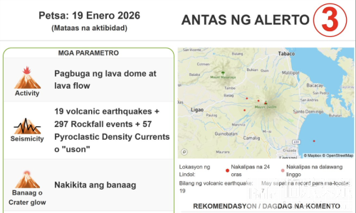 菲律宾火山与地震研究所(PHIVOLCS)表示,马荣火山仍维持三级警戒(增强不稳定/岩浆不稳定),火山仍对周边地区构成多种威胁,包括岩石崩落、滑坡、抛射碎块、熔岩流与熔岩喷泉、中等规模爆炸,以及在持续暴雨时可能发生的泥流。