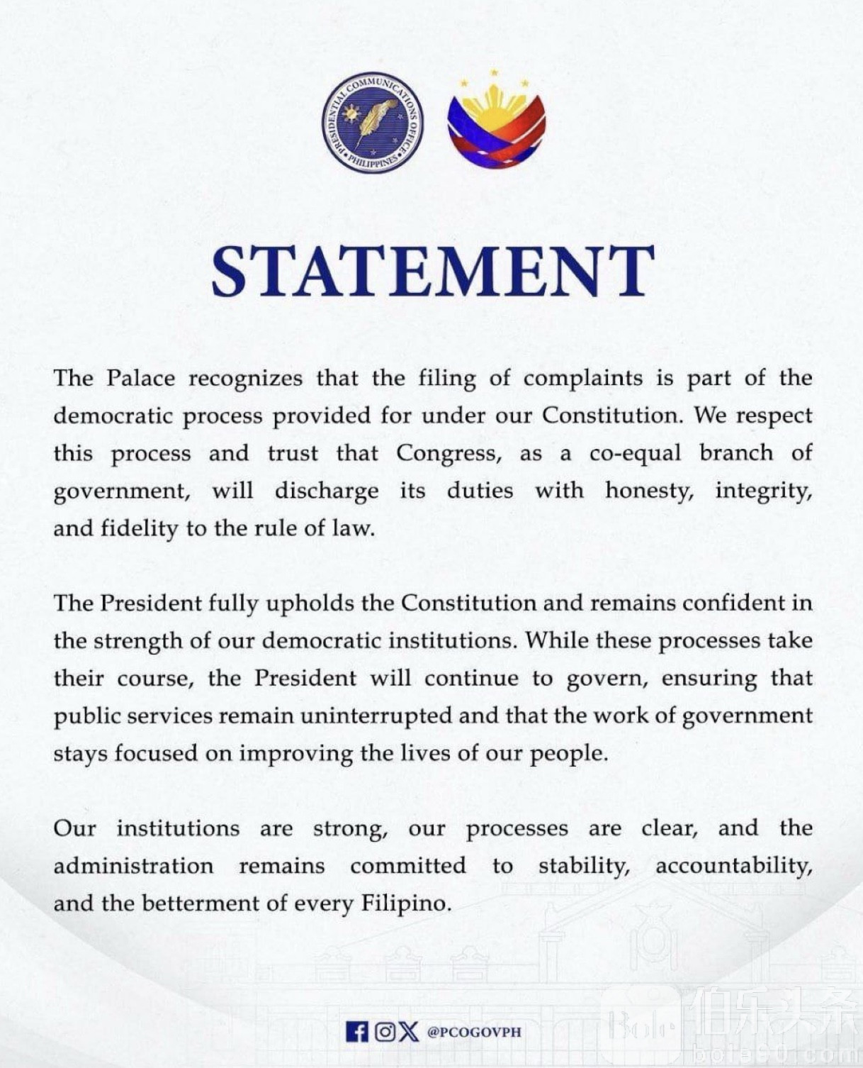 总统府声明强调,在弹劾程序推进期间,总统马科斯将继续履行国家领导人的职责,专注于日常政务和国家事务运作,不会因政治进程而中断施政工作。声明由总统府通讯办公室发布,显然意在向公众传递“政府运作照常”的信号,同时淡化事件对行政运作可能带来的冲击。