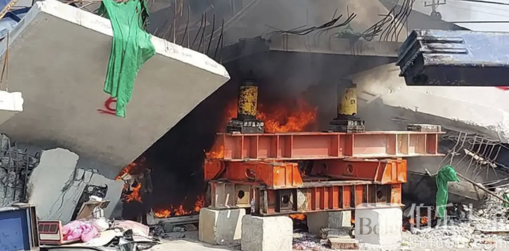 伯乐头条专讯:泰国曼谷拉玛二路近日再次发生施工事故惊魂,原本已坍塌的吊车残骸在1月20日凌晨再次起火,浓烟和火光从残骸中冲天而起,引发周边居民和过路民众恐慌。