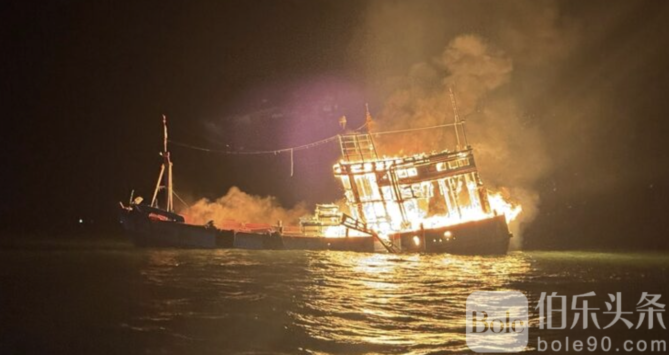 伯乐头条专讯:1月21日凌晨3时,泰国那叻他那育府塔沙拉区“泰德腾基金会”救援人员接报,在塔沙拉湾口海域发现一艘大型油轮正猛烈燃烧,黑烟滚滚,火势失控。现场确认油轮上原有4名船员,所幸在火灾初期,另一艘伴随船及时将船员安全接送上岸,无人员伤亡。