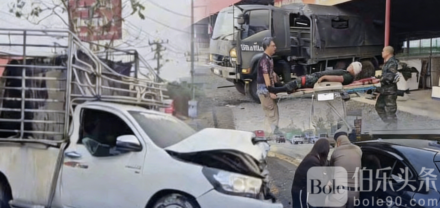 伯乐头条专讯:泰国中部沙拉武里府今日早晨发生一起严重交通事故,一名30岁女子驾驶黑色轿车强行超车未果,突然插入两辆军用车辆之间,导致军车紧急闪避失控,接连撞上运鸡零件的皮卡车及路边花岗岩商店,造成6名军人和2名平民受伤,现场一片狼藉。