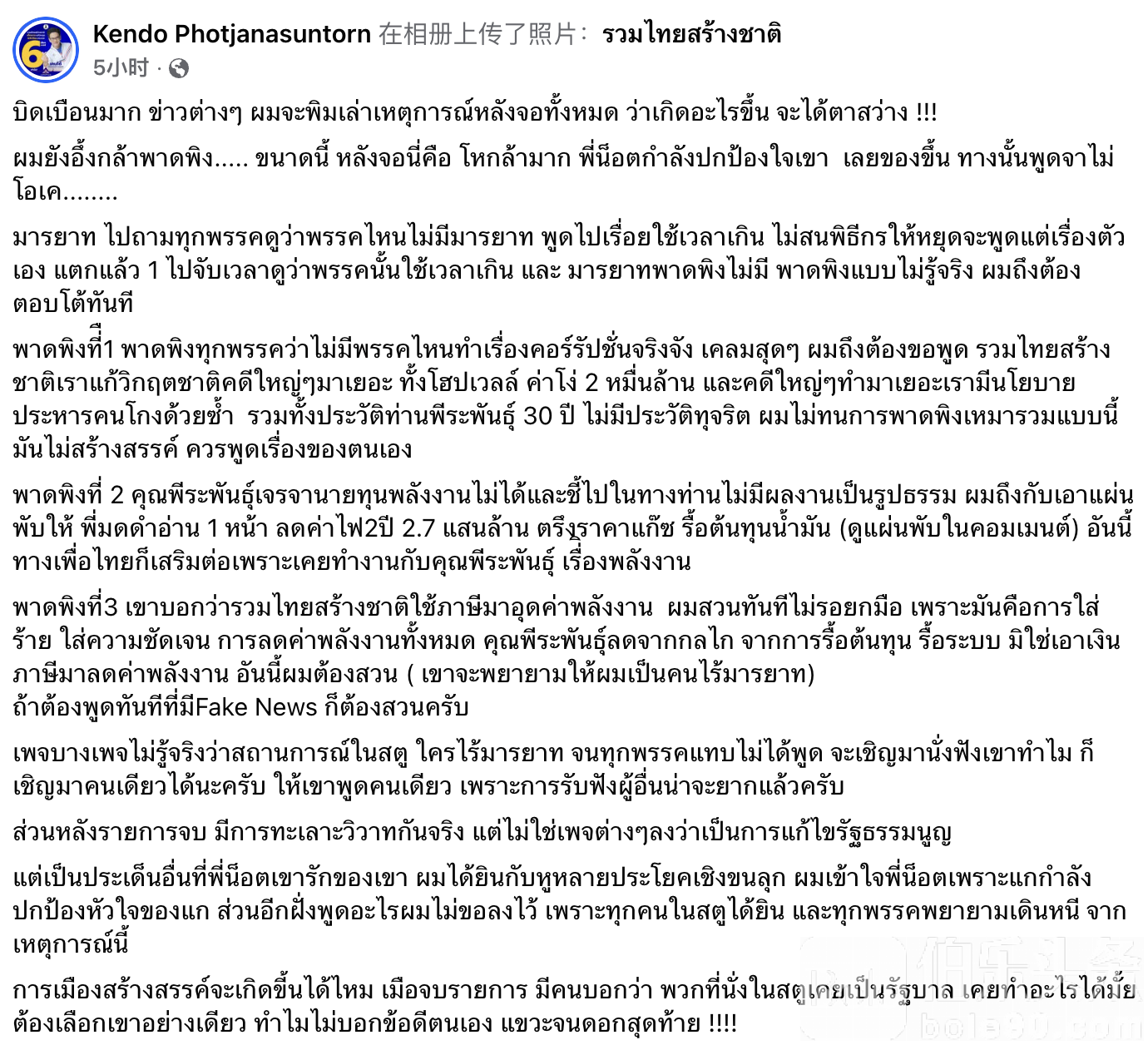 伯乐头条专讯: 泰国曼谷针对近期电视政论节目中涉及“统一泰国建设党”副发言人克里昂克莱玛·波詹苏顿(昵称“肯多”)与主持人及其他政党代表的争议性辩论,肯多于1月22日通过社交媒体发布声明,澄清事实并驳斥媒体报道的曲解。事件发生在一档节目中,当时“人民党”议员佩查·卡鲁那蓬与主持人诺特·沃拉里特就能源政策和政党廉洁度展开讨论,部分媒体将现场争论渲染为肢体冲突或修宪争执,引发公众热议。肯多表示,他当场反驳不实指控,是为了纠正节目中传播的假新闻,并非无故挑衅。