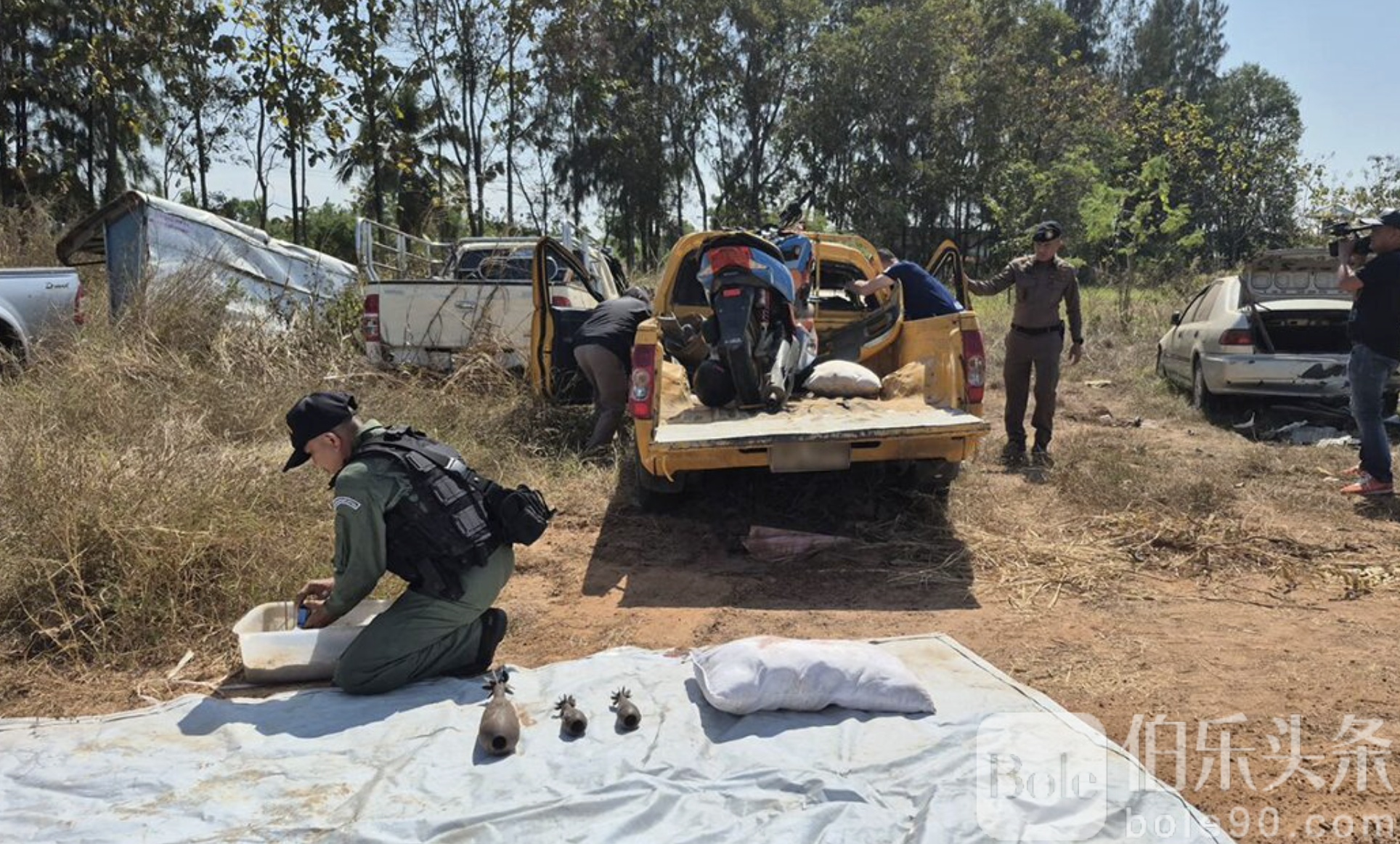 伯乐头条专讯:1月23日清晨,泰国武里南府巴空猜县发生一起离奇又惊悚的交通事故,一辆皮卡车失控撞上路边大树,司机重伤送医,但警方到场检查时,却在车内发现多枚军用迫击炮弹和大量巨型爆竹,现场一度被视为“随时可能爆炸”的高危区域,紧急出动拆弹部队封锁道路处理。