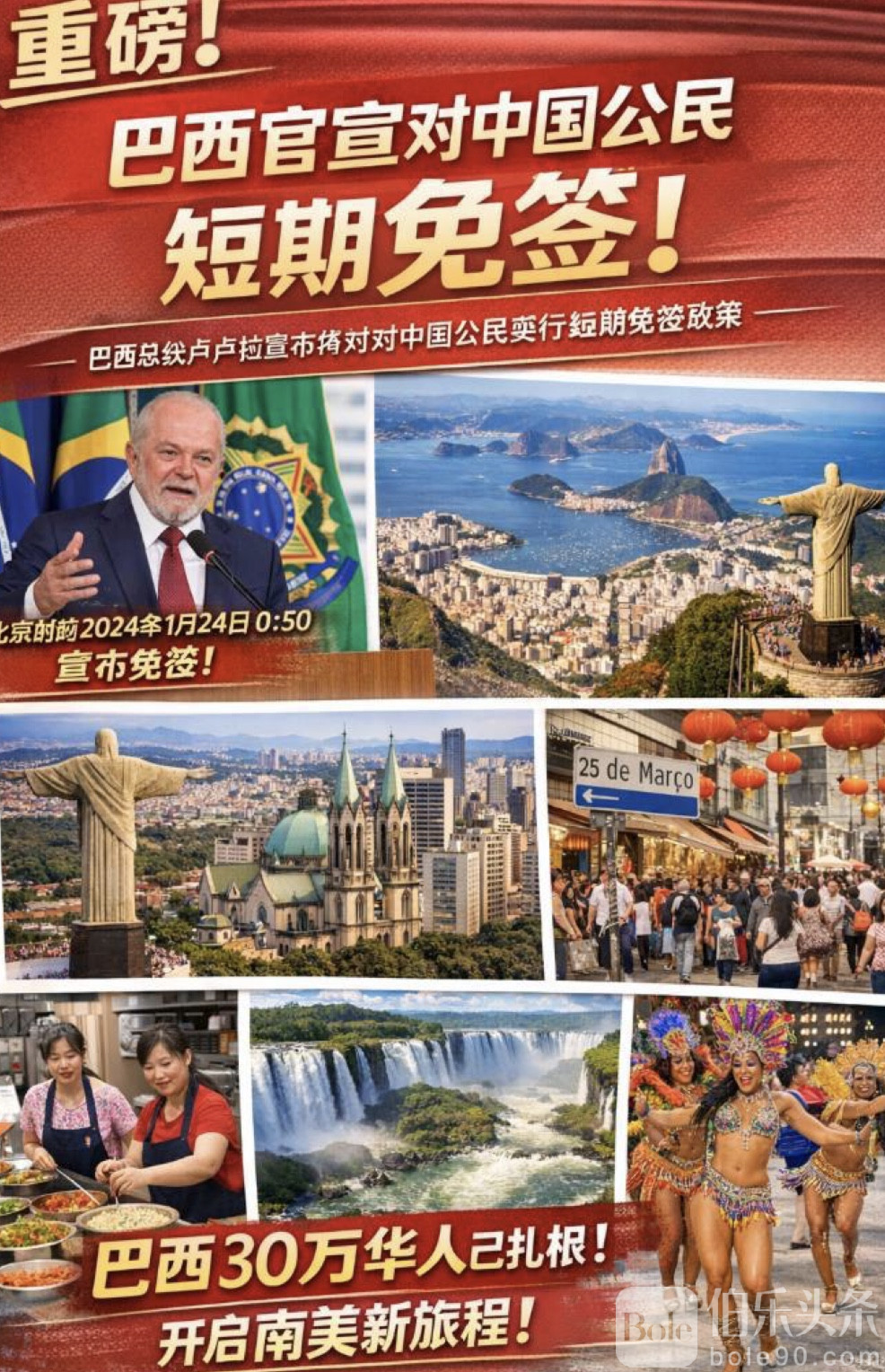 伯乐头条专讯:巴西总统卢拉于北京时间1月24日0:50正式宣布,巴西将对中国公民部分短期签证类别实行免签政策。尽管具体实施时间、适用签证类别及停留天数等细节尚需等待巴西外交部后续通知,但这一消息已在国内外引发广泛关注。