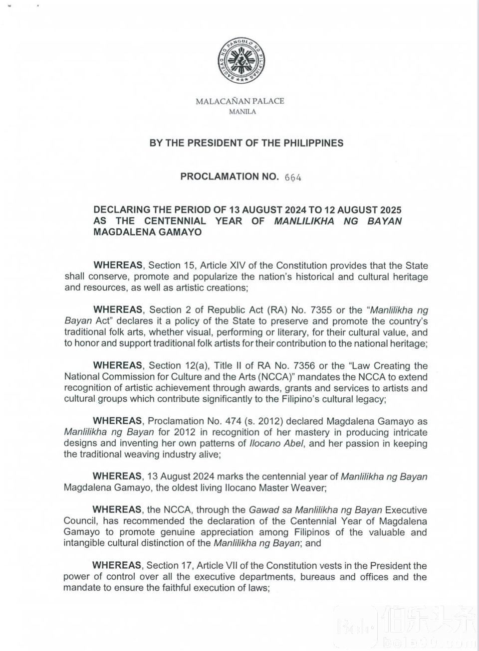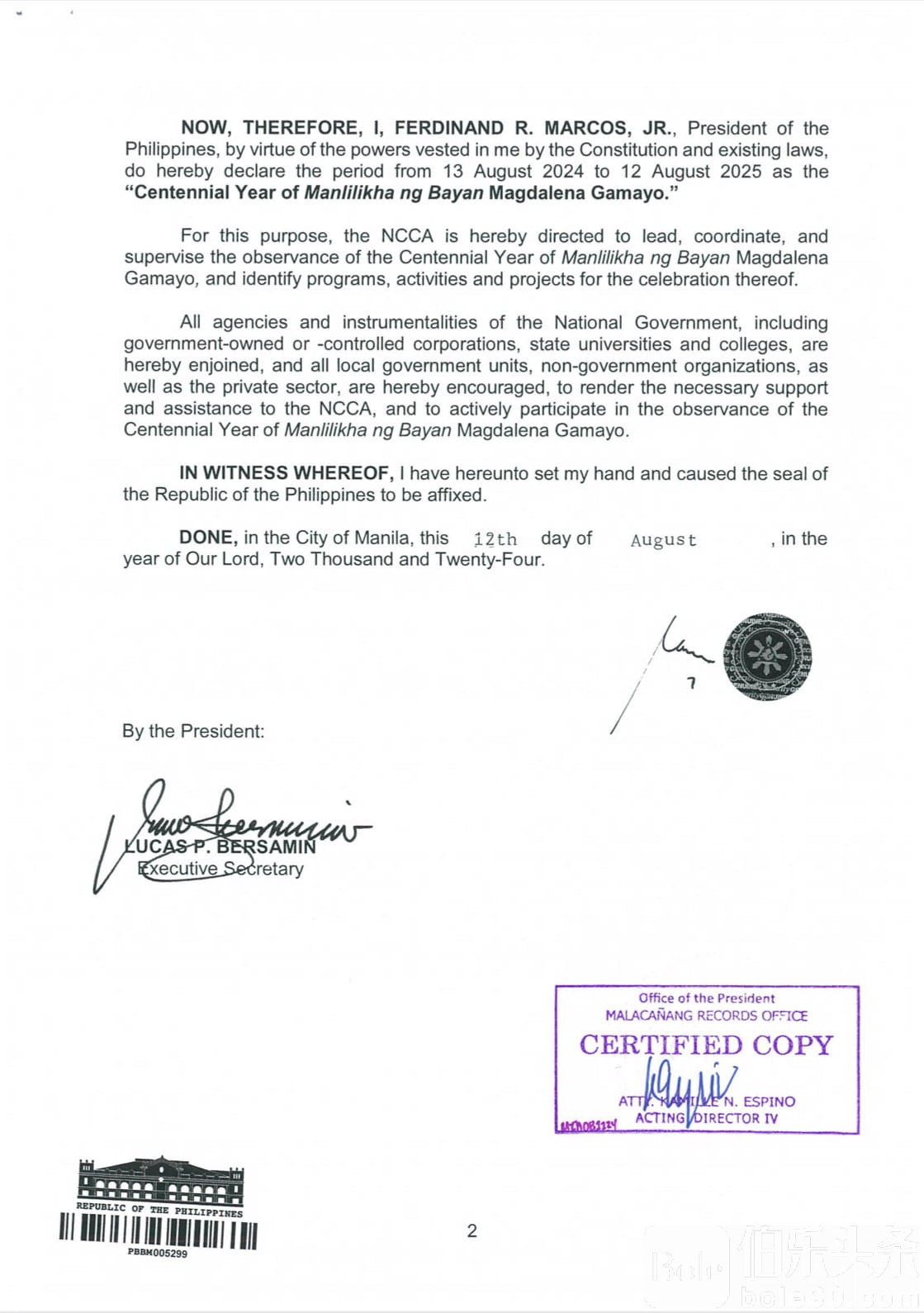 在今天的庆祝活动中,加马育迎来了她的百岁生日。为此,总统小马科斯签署了第664号公告,正式宣布从2024年8月13日起至2025年8月12日为“人民创作者玛格达莱娜·加马育百年庆典”。