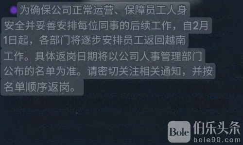 根据安排,自2月1日起,公司将分批组织员工返岗越南,并逐步过渡至居家办公模式。所有员工将统一获得5天缓冲期,用于处理网络、设备等居家办公准备事项。在此期间,无论使用电脑还是暂时通过电话办公,薪资均照常发放。