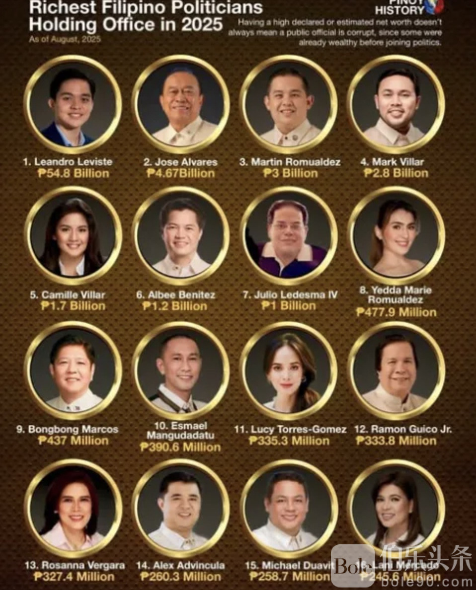 根据多份资产申报表,菲律宾多名高层民选官员身家不菲,包括总统马科斯申报净资产3.89亿比索,总评估值达13.75亿比索;参议员马克·维惹为12.6亿比索;参议员拉菲·杜福及其配偶、众议员乔斯琳·杜福合计10.5亿比索。而青年党团与部分新进议员的净资产则不到百万比索,与富豪形成鲜明对比。