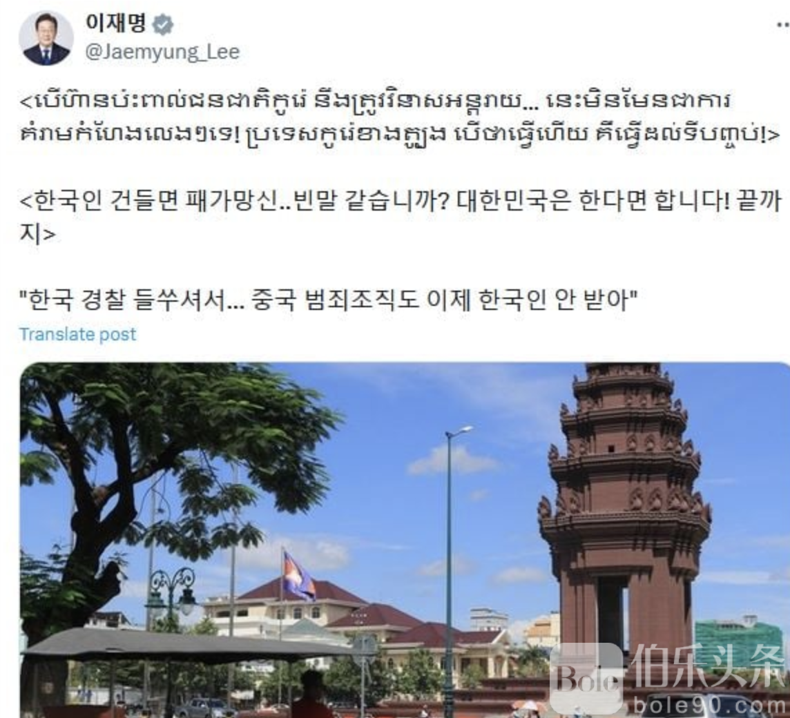 伯乐头条专讯:韩国总统李在明于1月30日通过社交平台“X”发布多语言声明,其中包括高棉语内容,向全球犯罪集团发出极为强硬的警告,明确表示任何针对韩国公民的伤害、绑架、诈骗或威胁行为,都将遭到韩国国家力量的全面反击,后果将是“无法承受的代价”。