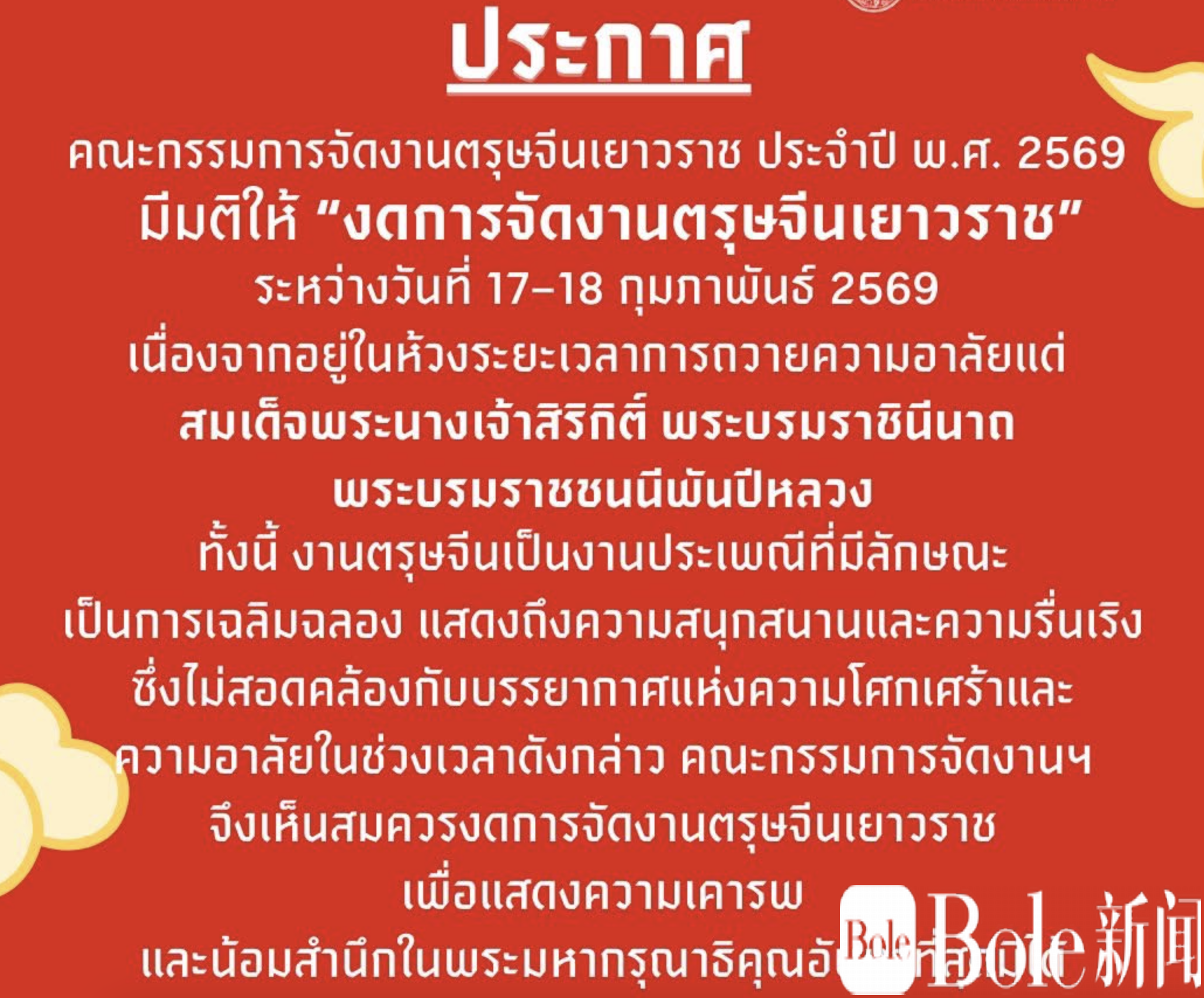 Bole新闻专讯:2026年曼谷唐人街原定于2月17日至18日举行的春节庆典活动,已由筹备委员会正式决定取消。泰国曼谷三攀他旺区办公室2月2日通过官方社交平台发布公告称,因目前仍处于为诗丽吉王太后陛下致哀的全国服丧期,相关庆祝活动不适宜继续举办。