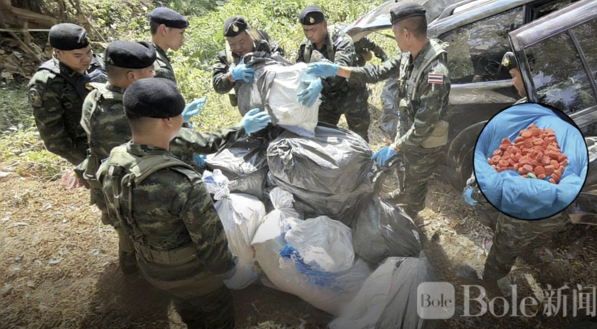 Bole新闻专讯:2月9日,泰国清莱府母塞县,泰国边境军“塔帕查克特作战部队”联合当地警方、地方行政部门及相关单位,成功查获涉嫌运输的大批毒品,总量约为5,340,000颗冰毒(甲基苯丙胺)。此案疑似毒贩趁泰国选举期间社会混乱试图走私。