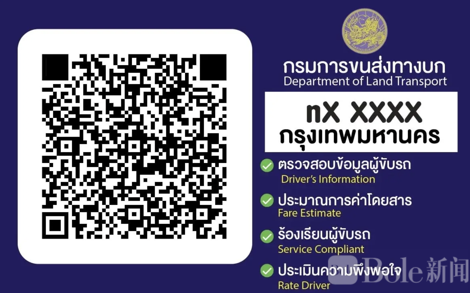 根据泰国陆路运输厅公布的信息,这套二维码系统一共分为紫色、蓝色和红色三种,分别对应司机身份核验、乘客查询与评价,以及紧急投诉用途。