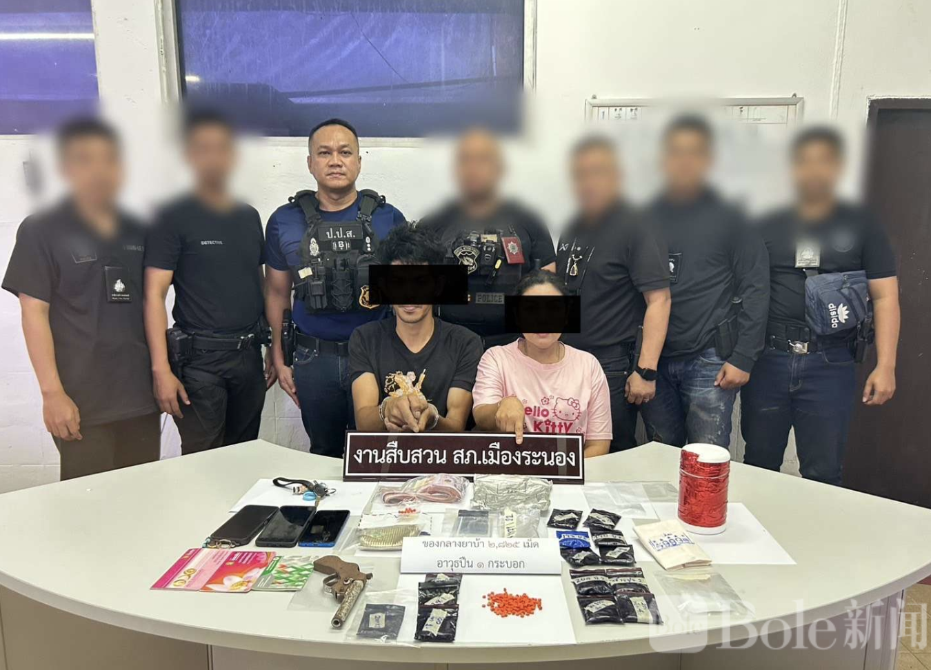 Bole新闻专讯:泰国肃毒办公室第八区近日联合兰廊府警察局展开突袭行动,在兰廊府市区邦林镇一带捣毁一个活跃多年的社区毒品分销点,当场逮捕一对“毒品夫妻档”,起获大量疯药、枪支及现金,并成功锁定上游供货女头目,全面掀开该地区地下毒网。