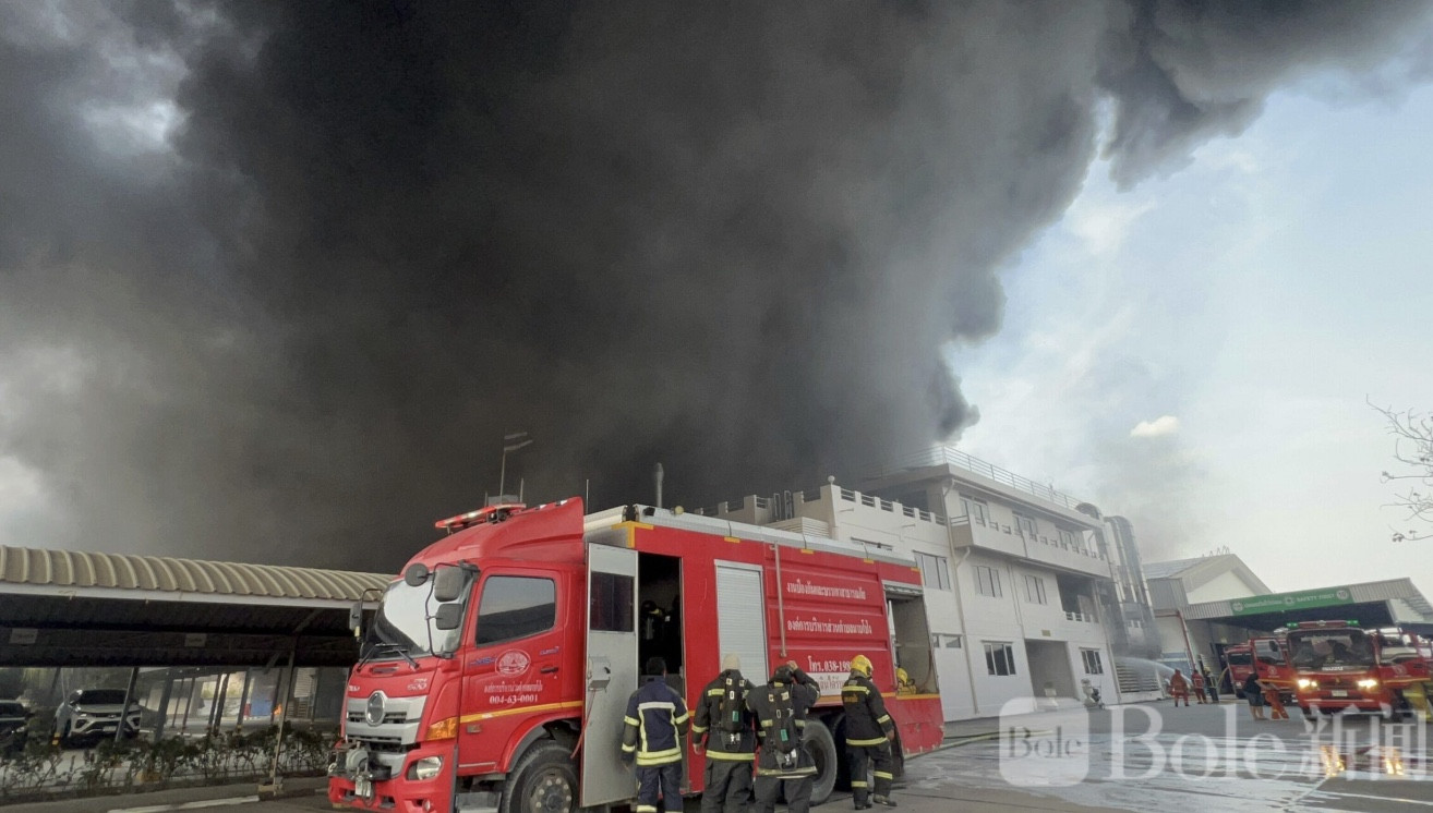 Bole新闻专讯:泰国春武里府攀通县一间油漆混合工厂18日下午突发火灾,火势凶猛并伴随间歇性爆炸声,十余辆消防车紧急驰援,但超过40分钟仍未能完全控制火情,现场一度浓烟冲天,情况相当惊险。