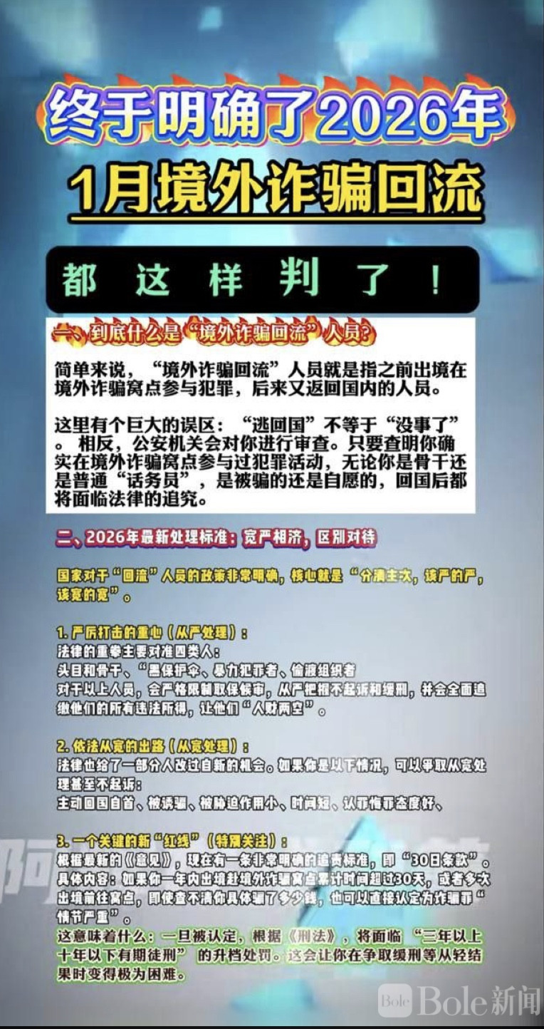 Bole新闻专讯:随着国家对跨境电信网络诈骗持续高压打击,2026年1月起,针对“境外诈骗回流”人员的处理标准进一步细化,呈现出“宽严分明、重点打击”的态势。所谓“境外诈骗回流”人员,是指曾出境前往诈骗窝点参与相关违法犯罪活动,之后返回国内的人员。需要特别提醒的是,回国并不等于“风平浪静”。只要经查实参与诈骗,无论是幕后骨干还是普通话务员,无论是主动还是受骗出境,都将依法追究责任。