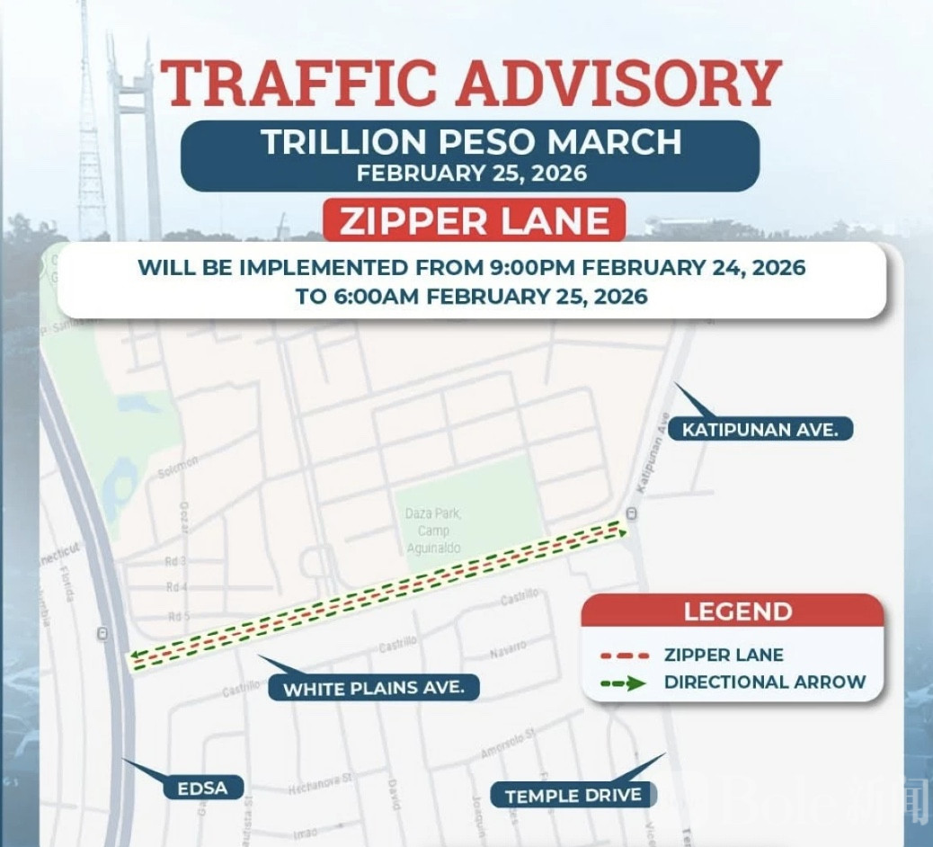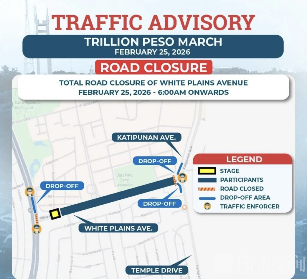 Bole新闻专讯:预计2月25日星期三,由卡里塔斯菲律宾及多个人权与民间团体发起的万亿比索大游行将从早上开始在EDSA人民力量纪念碑及周边地区举行,届时交通可能异常拥堵,司机们需提前规划绕行路线。
