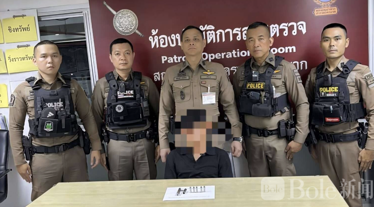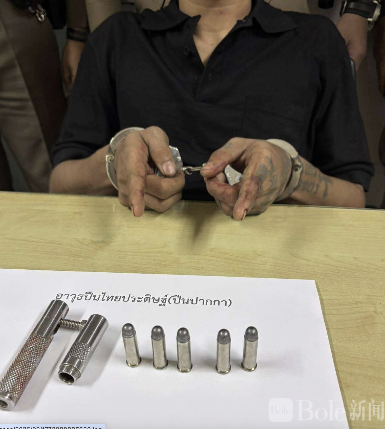 Bole新闻专讯:泰国曼谷市区警方在2月25日晚展开专项执法行动,成功抓获一名涉嫌非法持有自制枪械的25岁男子。此次行动中,警方缴获自制“笔式手枪”1把、.38口径子弹5发及一只黑色肩背包。