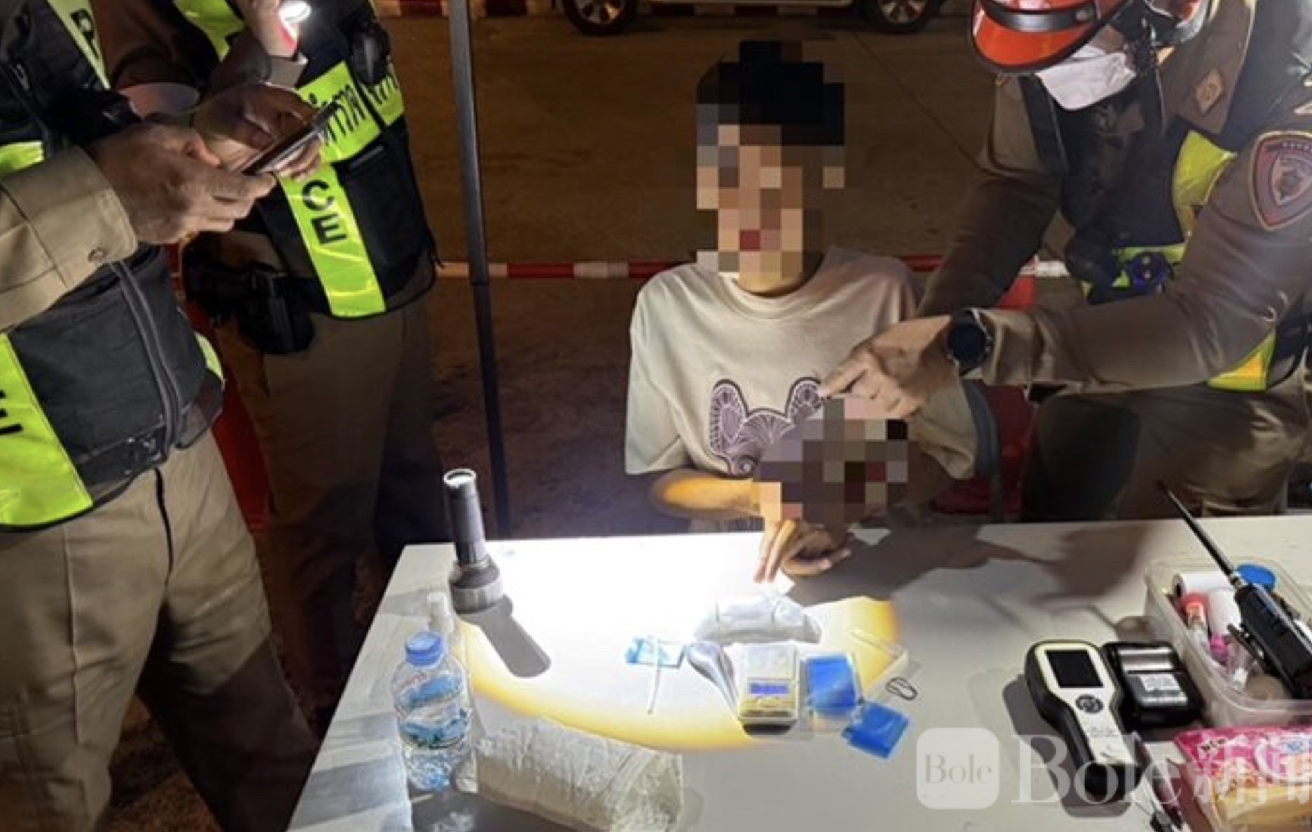 Bole新闻专讯:2月27日凌晨约2时25分,泰国警方在曼谷威帕哇迪兰实路(Vibhavadi Rangsit)入城方向设卡查酒驾时,意外查获一起毒品案件。一名26岁男子因形迹可疑被拦下检查,警方随后在其车内发现大量氯胺酮,总重约80克,当场将其控制。
