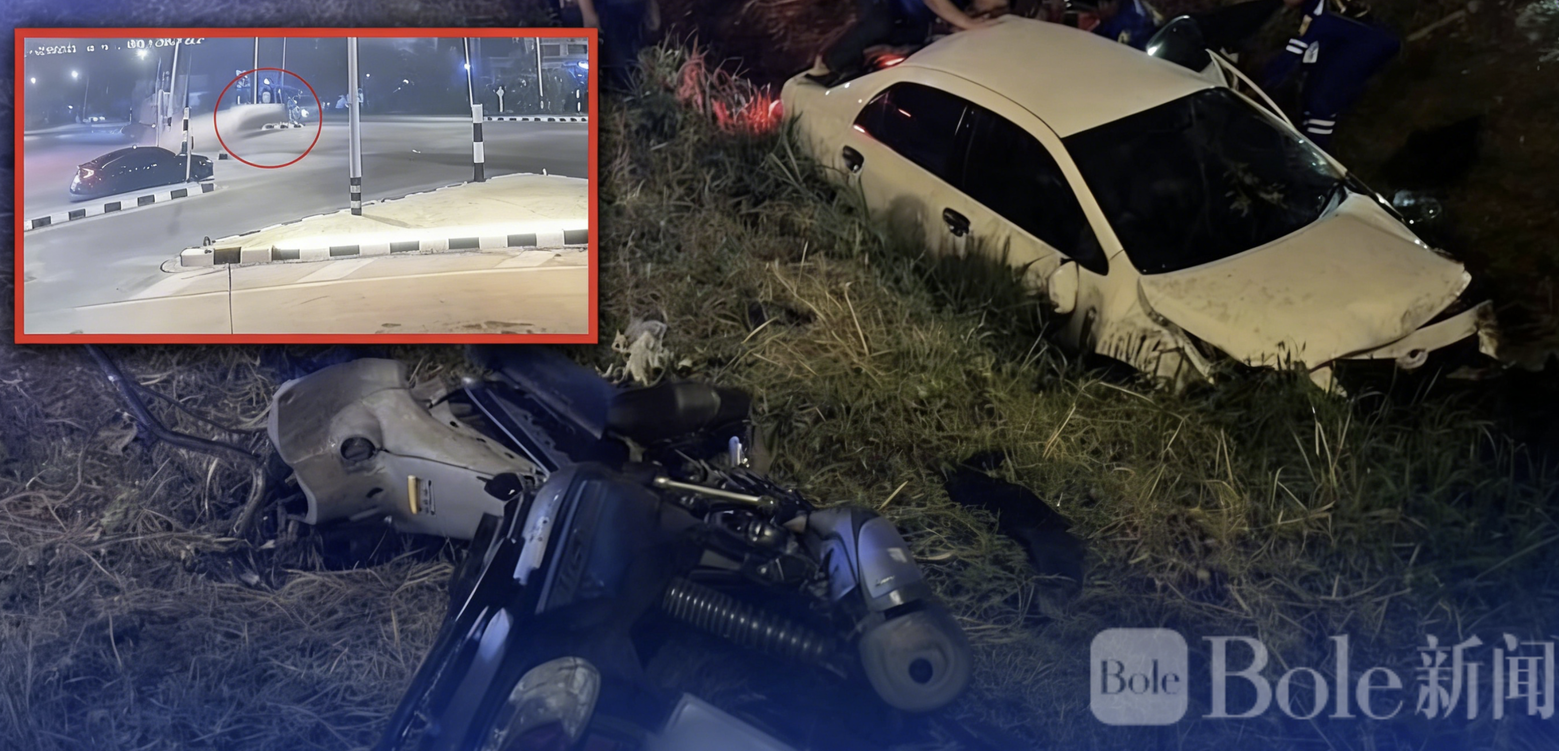 事故发生在午夜00:36,事发地点为阿塔蒙县红十字基金会十字路口。监控视频显示,一辆白色轿车高速从通通乡方向驶来,直接闯过红灯,猛烈撞击停在路口的摩托车,摩托车被撞飞十余米,而轿车则失控翻车掉入对面路边的水沟。