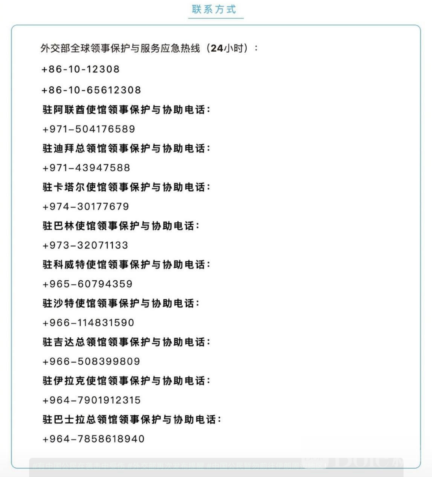 如遇突发紧急情况,应第一时间向当地警方求助,并尽快联系中国驻当地使领馆寻求协助与保护。外交部门同时呼吁在伊中国公民务必保存并熟记使领馆应急联系电话,及时关注权威发布信息,做好个人安全和撤离准备。
