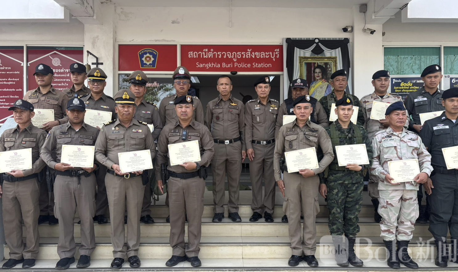 在现场会议期间,北碧府警察指挥部还向当地警察、行政人员、移民警察以及边境巡逻警察颁发荣誉证书,表彰他们在打击跨境犯罪和电信诈骗方面的贡献。警方透露,过去一年内,北碧府警方共逮捕涉嫌电信诈骗人员约100人,其中包括多名外国人,并查获毒品、运送车辆以及多批逃税走私商品。