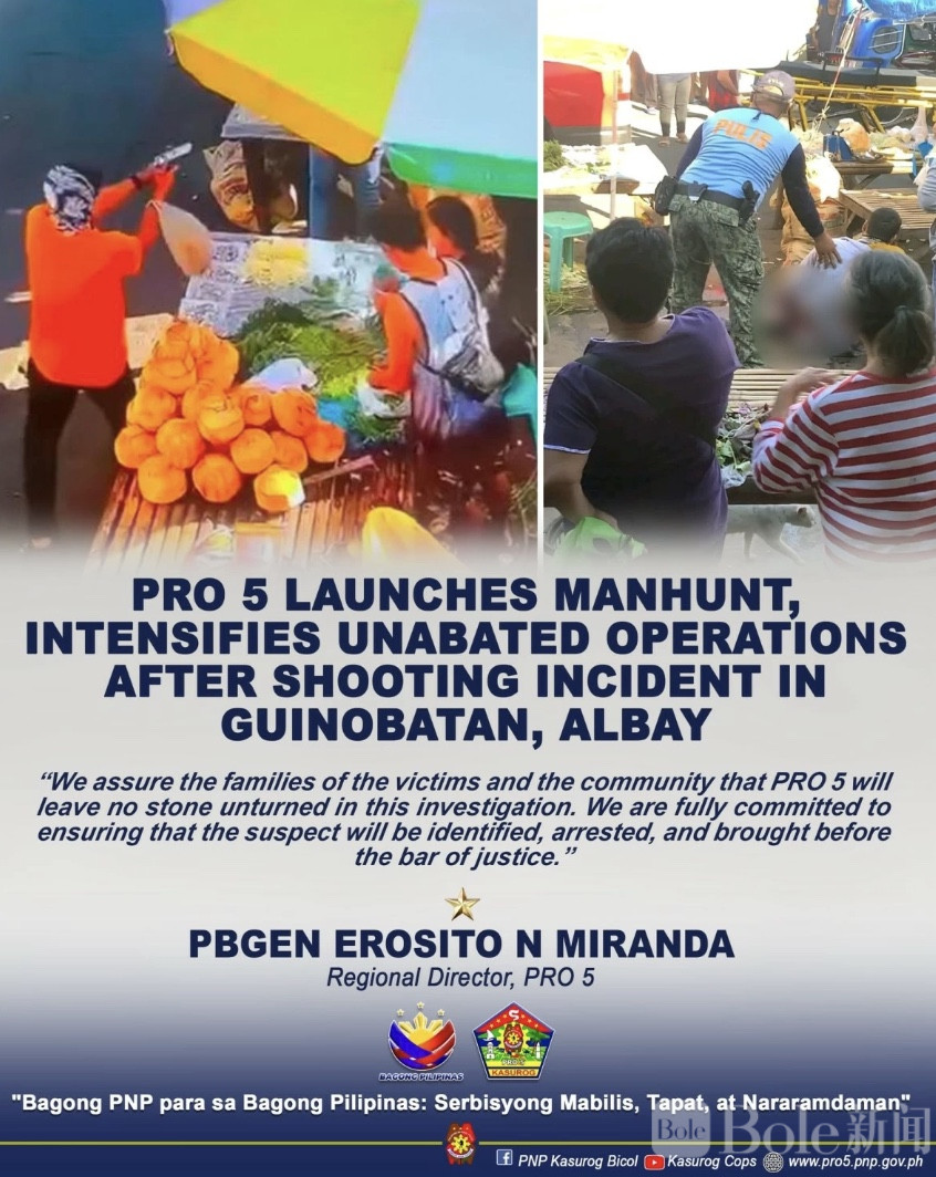 Bole新闻专讯:菲律宾阿尔拜省吉诺巴坦公共市场于3月6日发生悲剧,一名33岁的印度商人在收取摊贩贷款款项时遭遇枪击,不幸当场身亡。当地警方发言人马鲁·卡鲁巴基布中校表示,袭击者当时突然出现并开枪,随后迅速逃离现场。