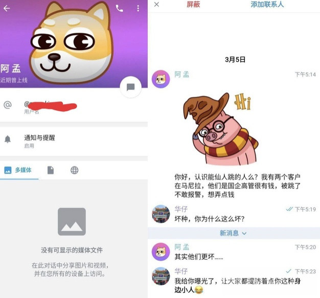 “你好,认识能仙人跳的人么?我有两个客户在马尼拉,他们是国企高管,很有钱,被跳了,不敢报警,想弄点钱(靠仙人跳坑同胞止损)。”