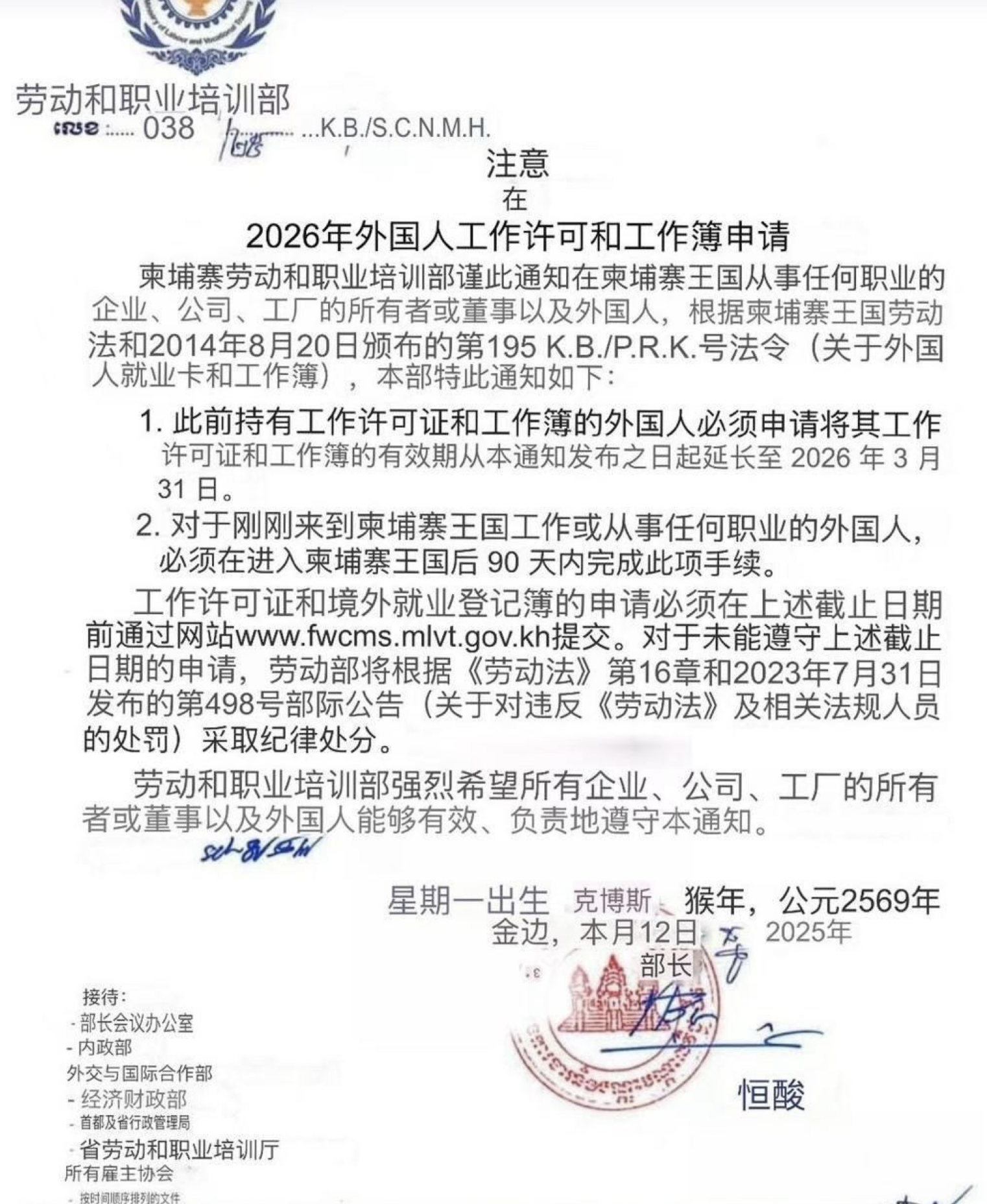 Bole新闻专讯:柬埔寨政府近日发布劳工证办理最新通知,提醒所有持有2025年劳工证的人员务必在2026年3月31日前完成2026年劳工证的申请,以免产生罚款。