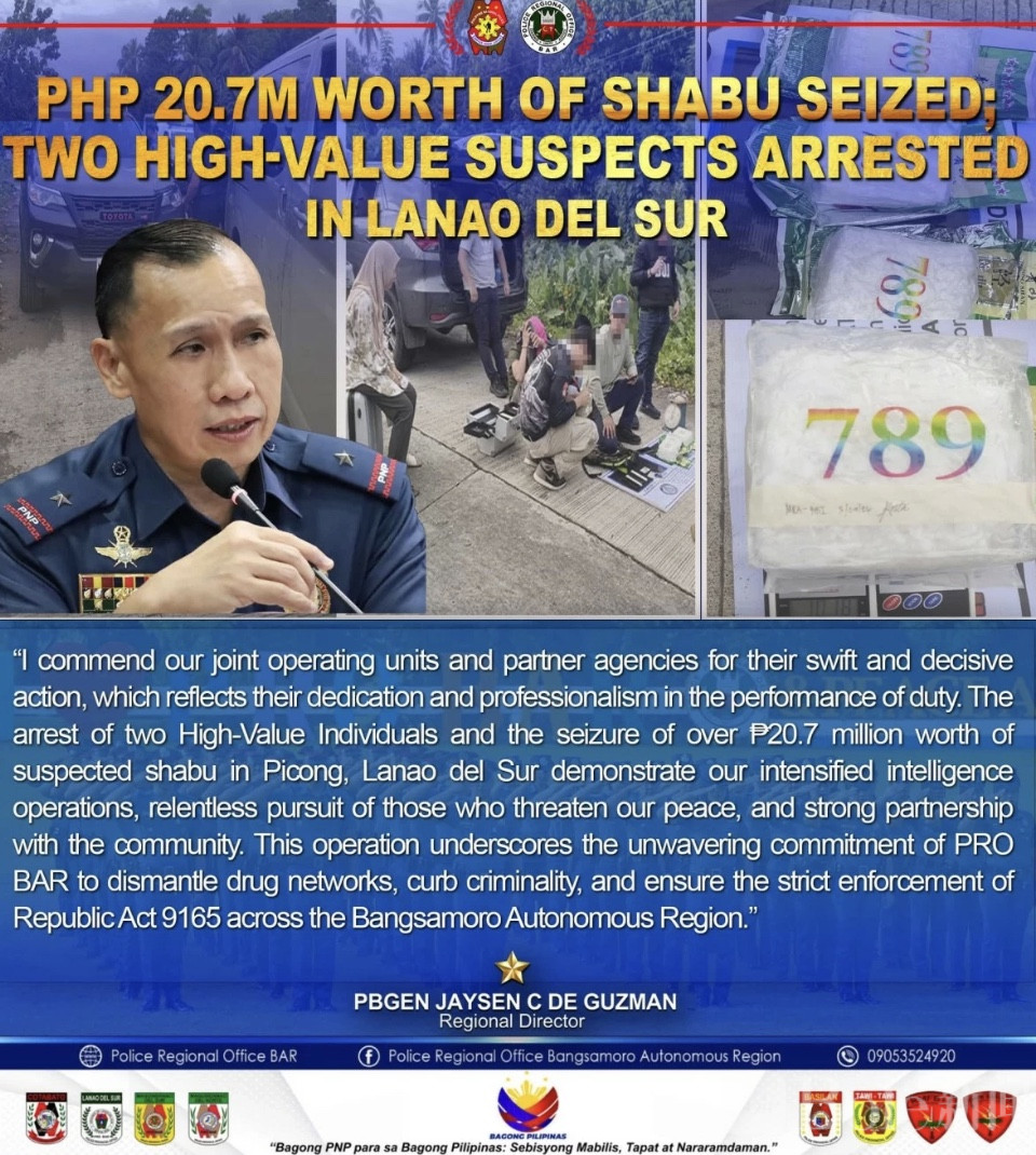 Bole新闻专讯:菲律宾警方在兰老 del Sur 省展开一场精准的卧底扫毒行动,成功抓获两名涉嫌贩毒的商人,当场起获 3 公斤冰毒,涉案毒品价值高达 2076.72 万比索,同时缴获赃款、作案工具及涉案车辆,两名高价值毒贩悉数落网。
