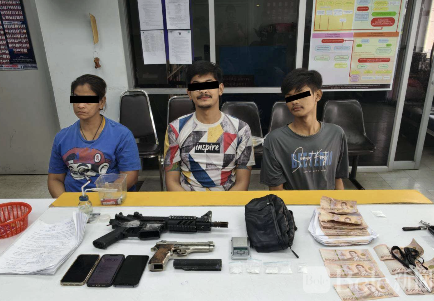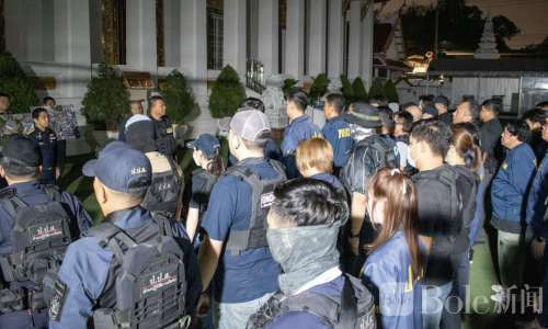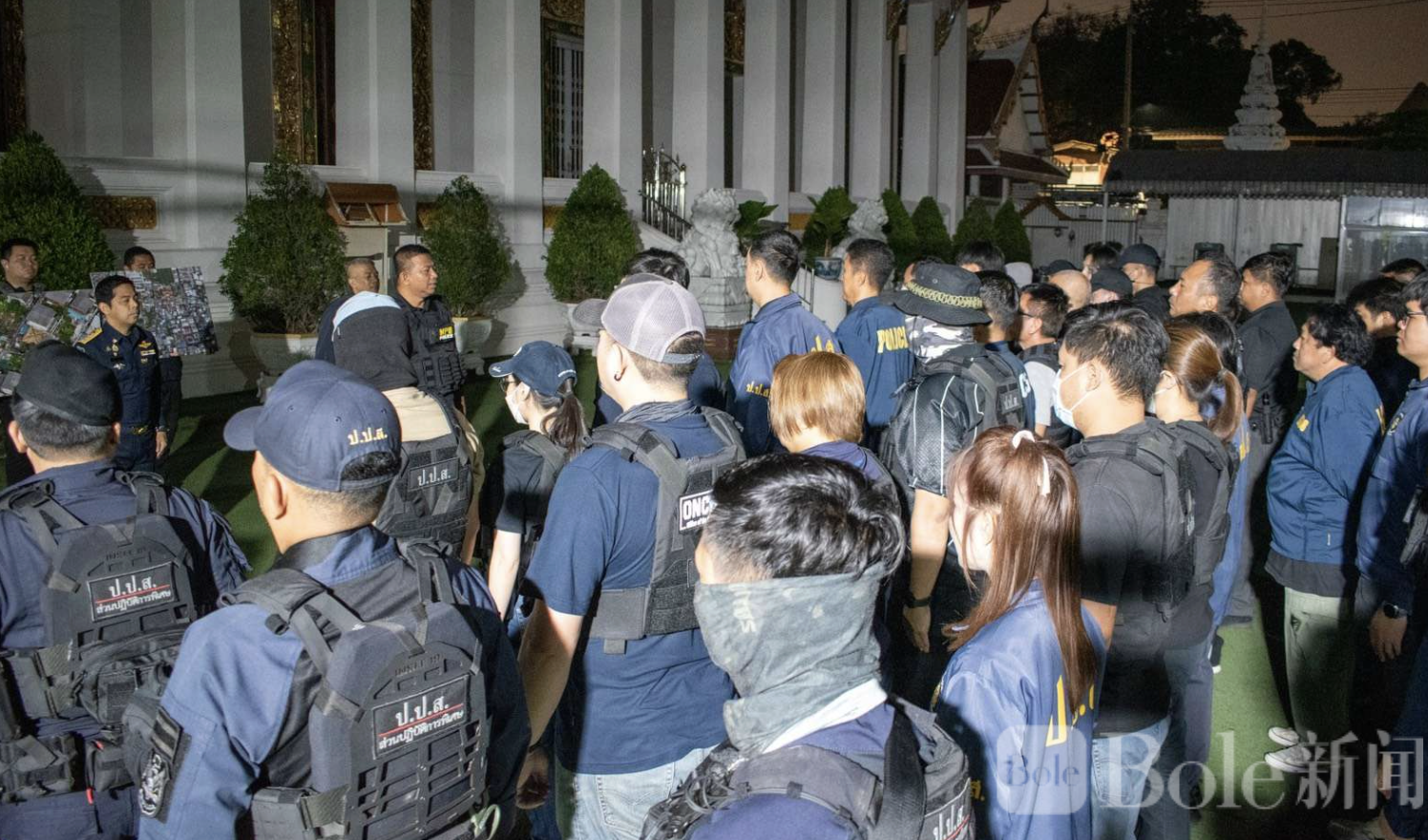 Bole新闻专讯:泰国警方与禁毒部门13日清晨展开大规模突袭行动,在曼谷吞武里一带捣毁一个隐藏在寺庙后巷的毒品窝点,现场不仅查获多种毒品,还发现团伙竟暗中制作假钞。行动共逮捕6名嫌犯,并缴获枪支、毒品及多张尚未裁切完成的千泰铢假钞。