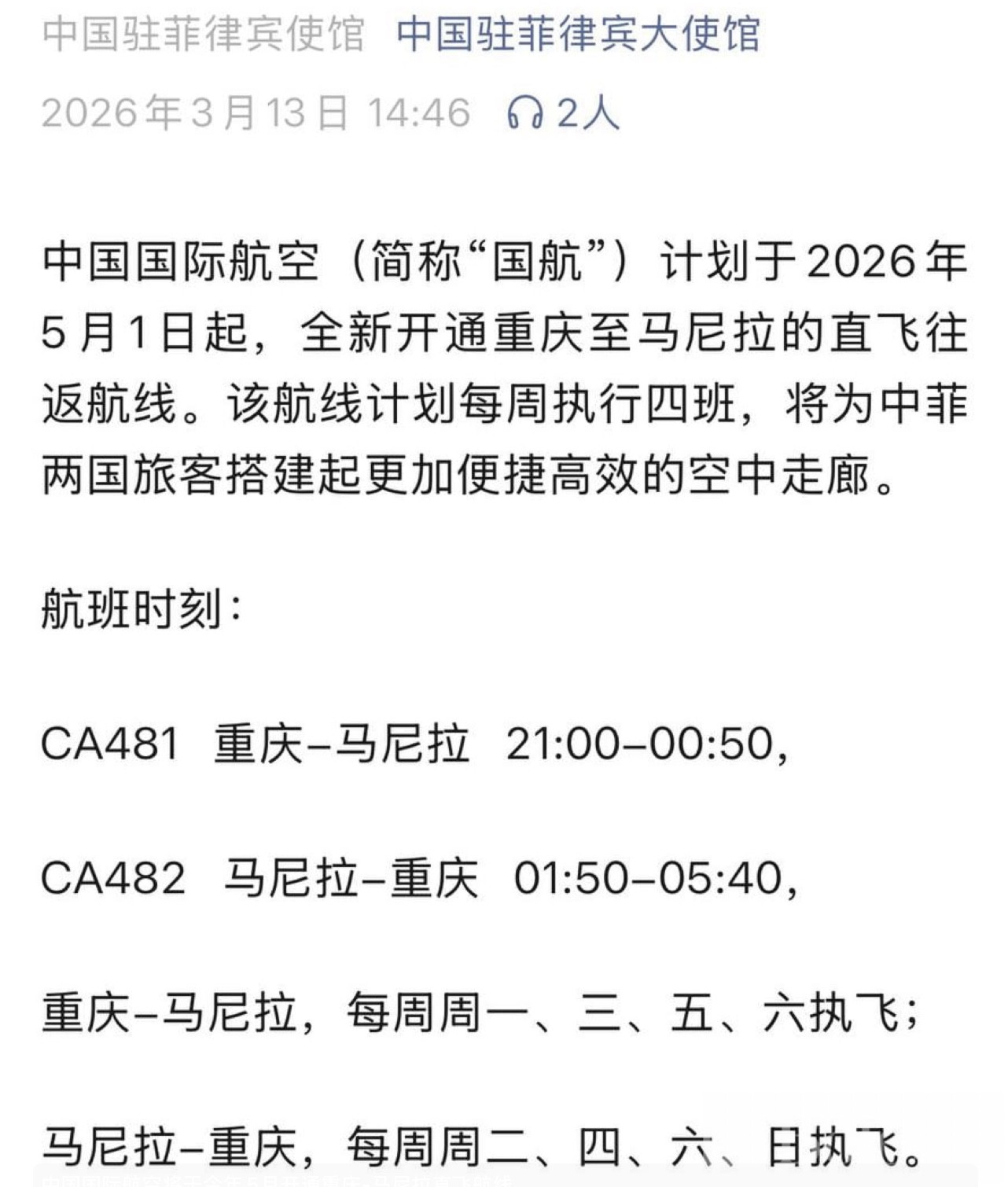 Bole新闻专讯:据“中国驻菲律宾大使馆”微信公众号消息,中国国际航空计划于2026年5月1日起,全新开通重庆至马尼拉的直飞往返航线。该航线计划每周执行四班,将为中菲两国旅客搭建起更加便捷高效的空中走廊。