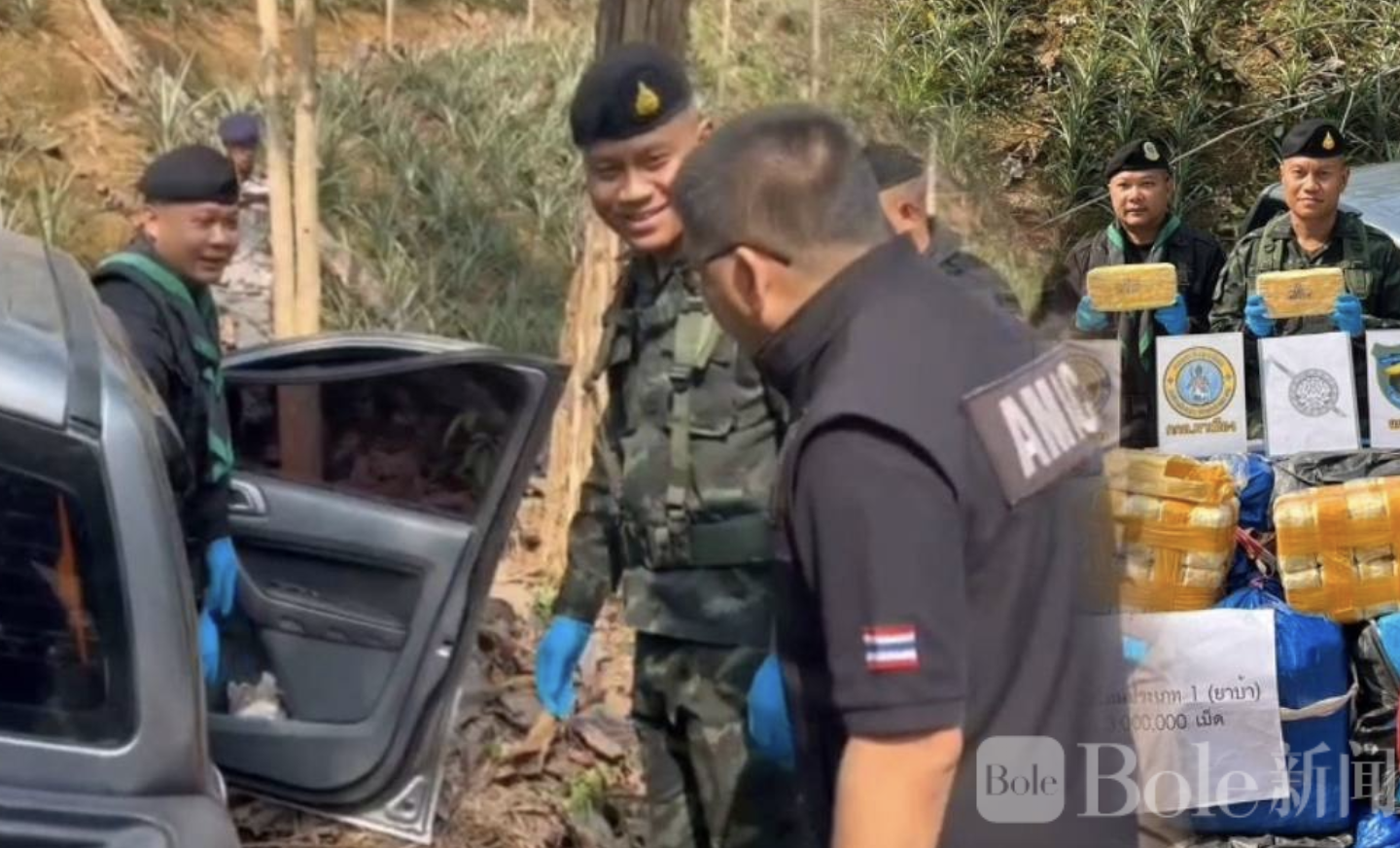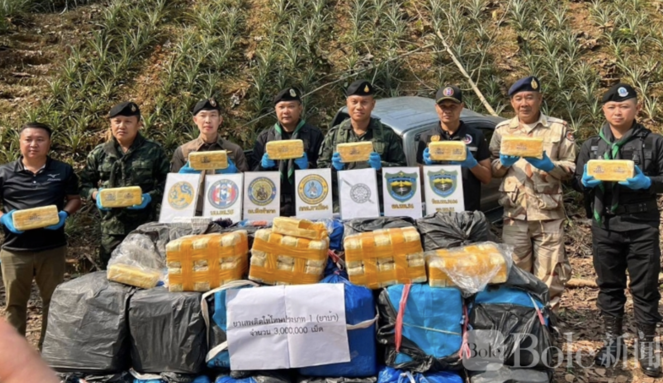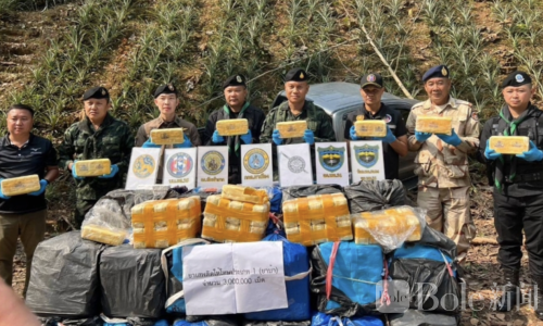 Bole新闻专讯:泰国北部清莱府近日发生一起大规模毒品查获事件,一辆皮卡试图从边境运送毒品进入内陆地区,在被军警设卡拦截时高速逃逸,最终弃车逃跑。执法人员在车内发现20个麻袋,共装有约300万颗甲基苯丙胺(俗称“冰毒”),已被移交给แม่จัน警察局处理,并展开追捕涉案团伙。