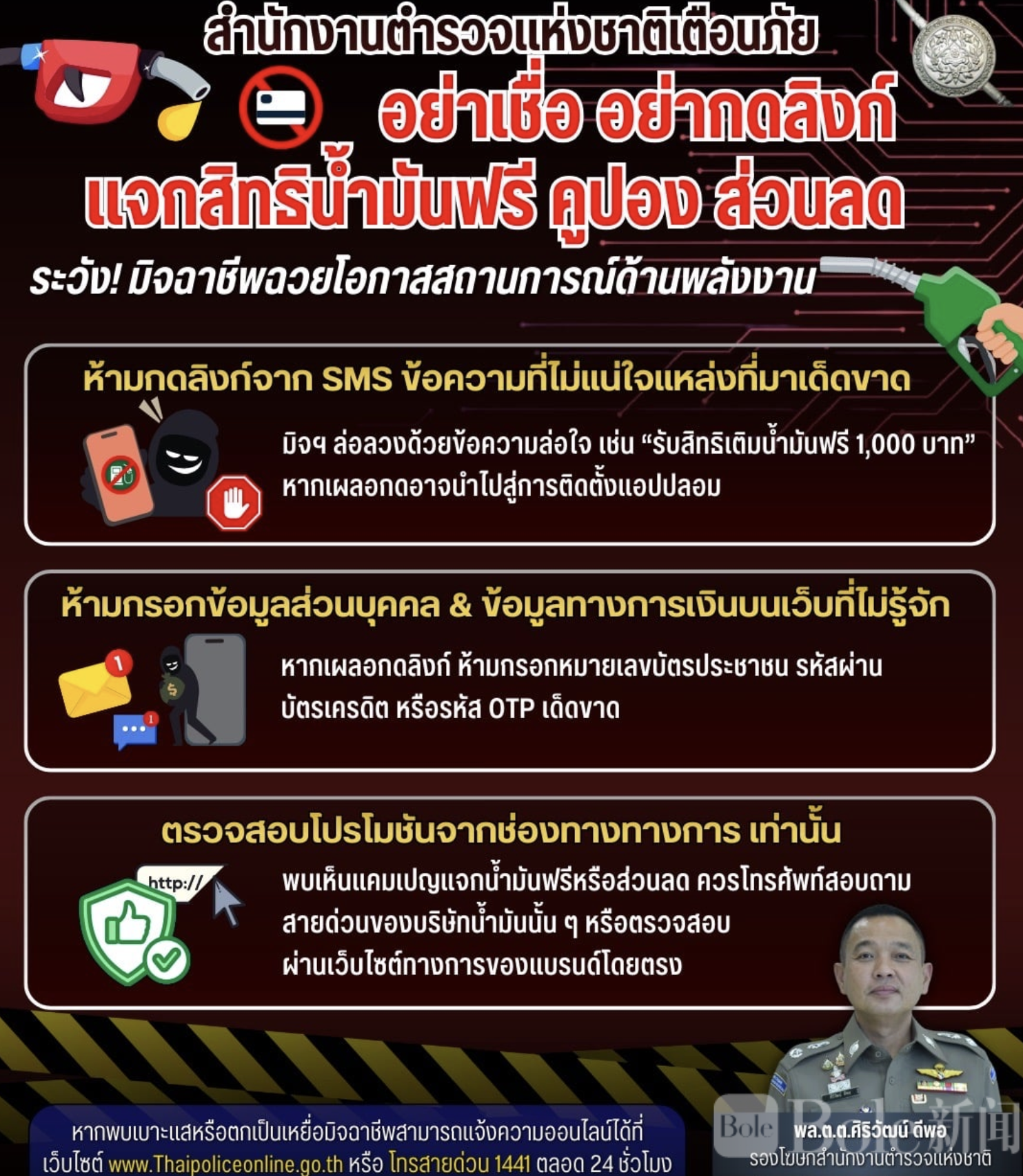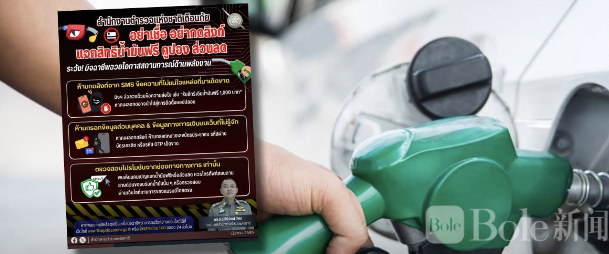 Bole新闻专讯:泰国皇家警察总部近日提醒民众,近期有不法分子趁全球能源价格波动及国际冲突造成的燃油焦虑,散布虚假链接,诱导民众领取所谓“免费加油券”或“加油折扣”,实际目的是窃取个人信息并安装恶意应用程序。