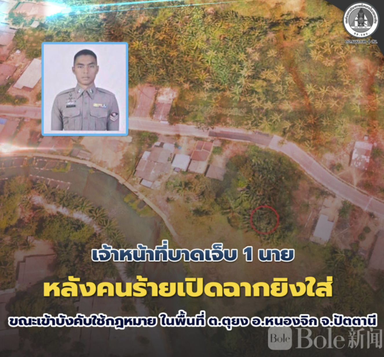 Bole新闻专讯:泰国南部帕塔尼府再度发生激烈枪战。2026年3月16日上午9时,泰国第四特区保安指挥部派员在帕塔尼府龙吉区图永乡执行法律行动,追查当地不安定因素及犯罪团伙时,遭遇歹徒开火,双方发生交火。