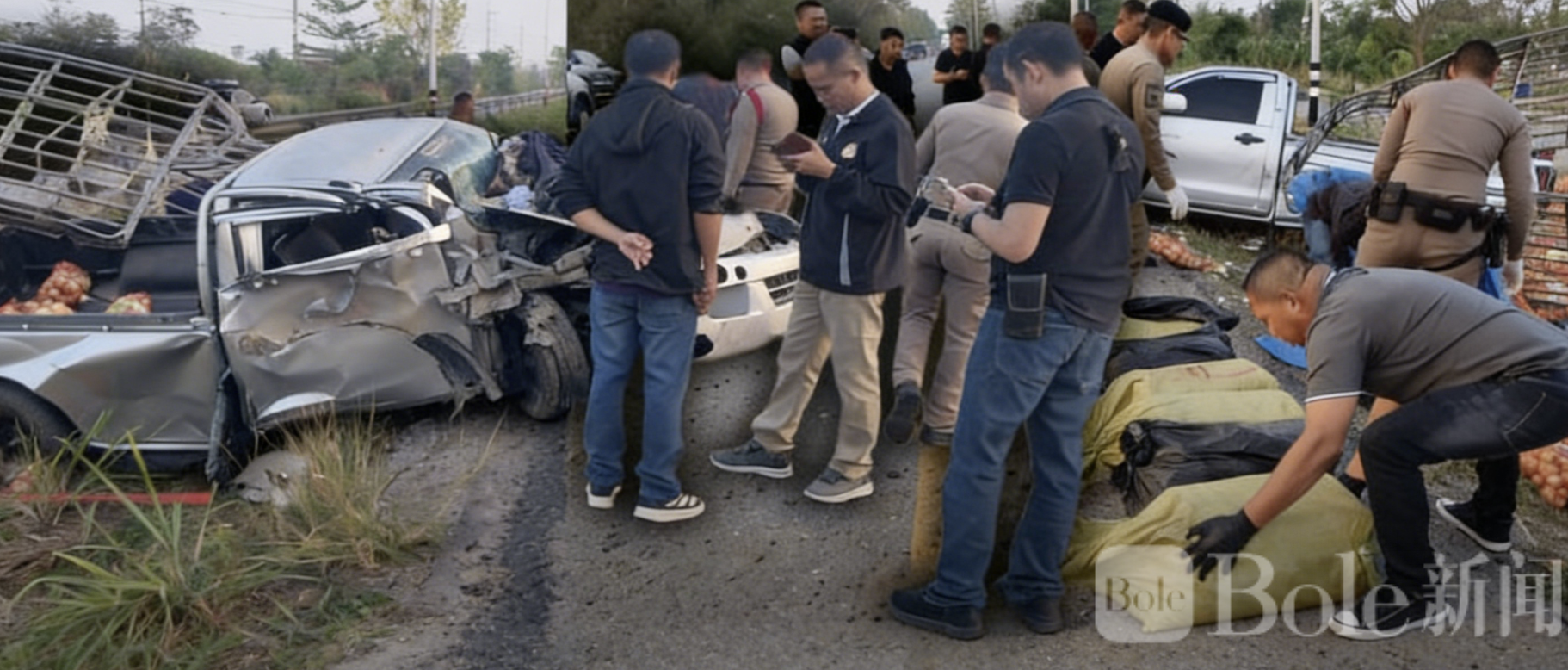 Bole新闻专讯:泰国北部近日发生一起看似普通的交通事故,却意外揭开重大毒品案件。一辆运载洋葱的货车在公路上失控翻覆,现场不仅散落大量农产品,更被警方发现暗藏超过300万粒毒品,司机则趁乱逃离,警方正全力追缉。