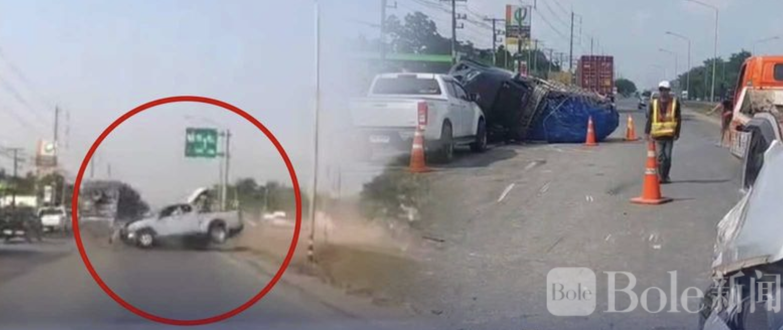 Bole新闻专讯:泰国巴真府日前发生一起多车连环交通事故,一名男子因疲劳驾驶失控,车辆越过中线后撞上一辆运输西瓜的货车,导致该货车侧翻,随后还波及两辆正在排队加油的车辆,共造成4辆车受损、1人受伤。