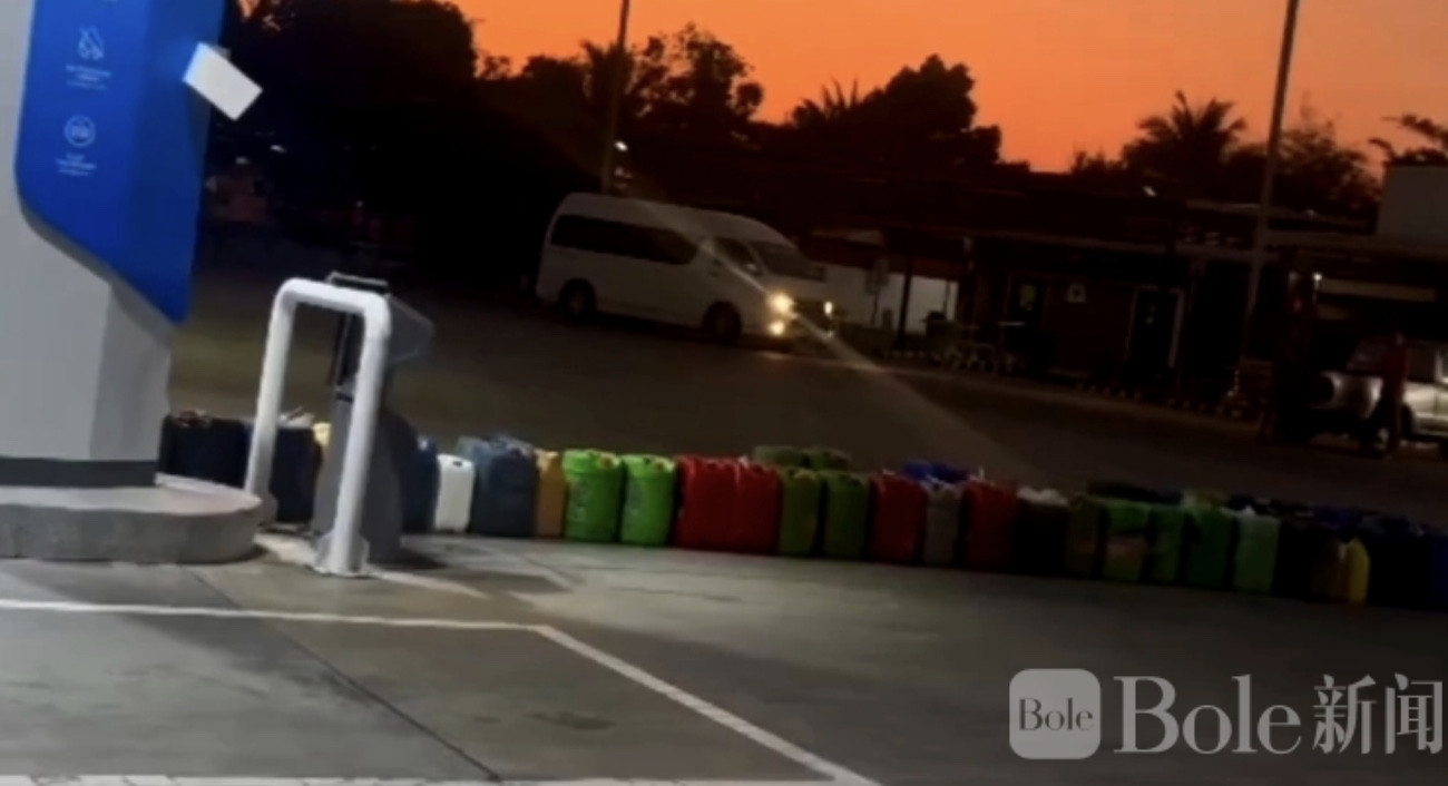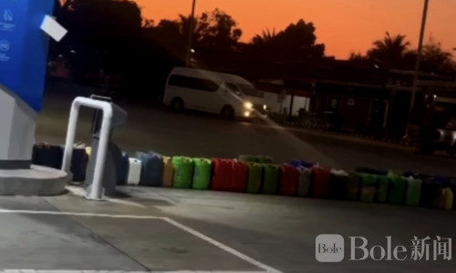 Bole新闻专讯:油荒的影子,似乎已经悄然逼近泰国南部。3月23日,一段在社交媒体上迅速传播的视频引发关注——宋卡府拉诺县的加油站外,密密麻麻摆满了油桶,像一条无声的长龙,排队“等油”。