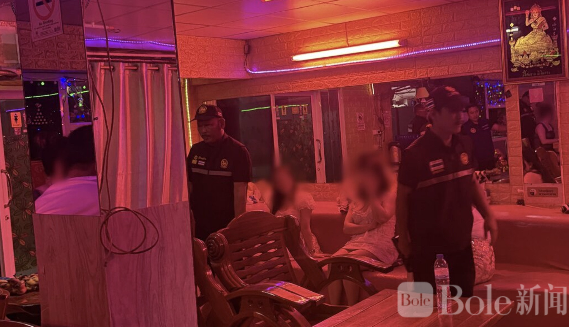 Bole新闻专讯:3月27日,泰国八里府(ฉะเชิงเทรา)地方行政部门联合警方,对当地一家知名卡拉OK展开突击检查。接到举报称该店营业超时,并雇佣邻国女子为客人提供服务,甚至涉嫌暗中出售额外服务。