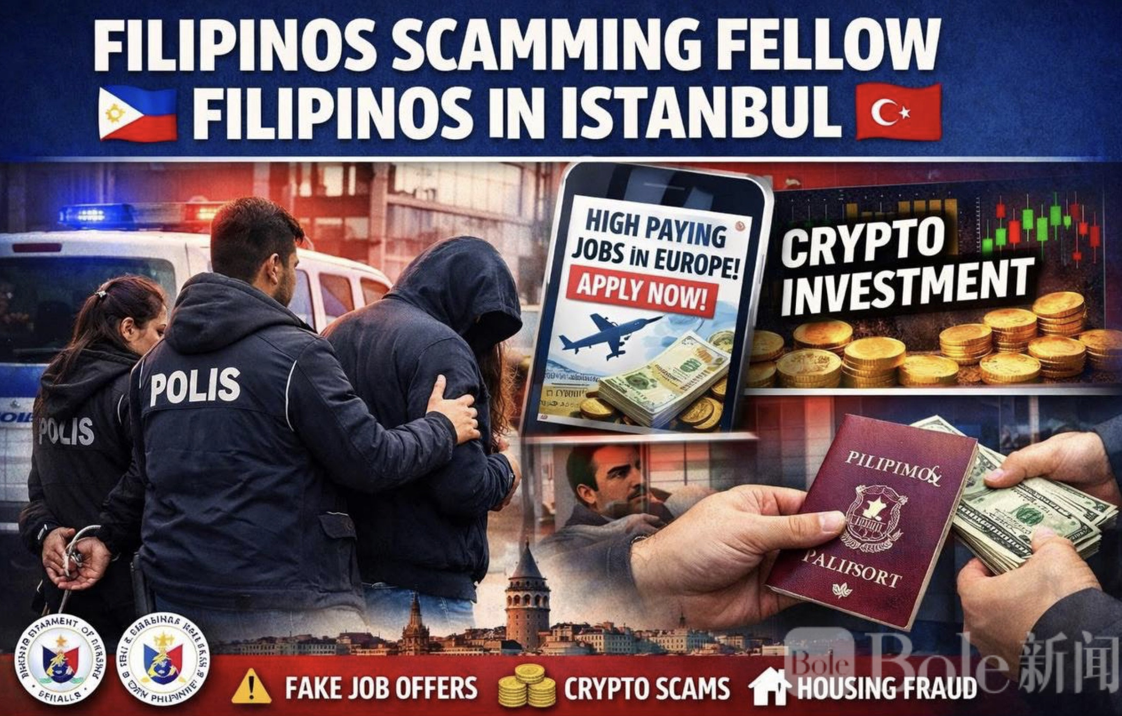 Bole新闻专讯:菲律宾官方近日证实,一起典型的“同胞骗同胞”诈骗案件正在调查中。多名菲律宾籍人员在土耳其涉嫌针对同为菲律宾籍的海外劳工实施欺诈,相关嫌疑人已被当地执法部门拘捕。案件发生于2026年2月16日,并于2月24日正式对外确认,涉案的受害者和犯罪嫌疑人均为菲律宾公民。