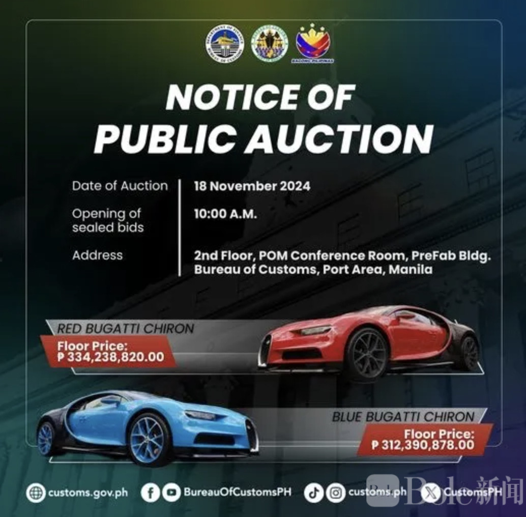 拍卖会定于11月18日上午10点在马尼拉港口举行,2017款蓝色布加迪奇龙起拍价为3.34亿比索(约4108万人民币),2019款红色布加迪奇龙起拍价为3.12亿比索(约3810万人民币)。有意竞拍的买家需先缴纳1500万比索保证金。此次拍卖不仅是清理海关仓库,也旨在筹集资金。