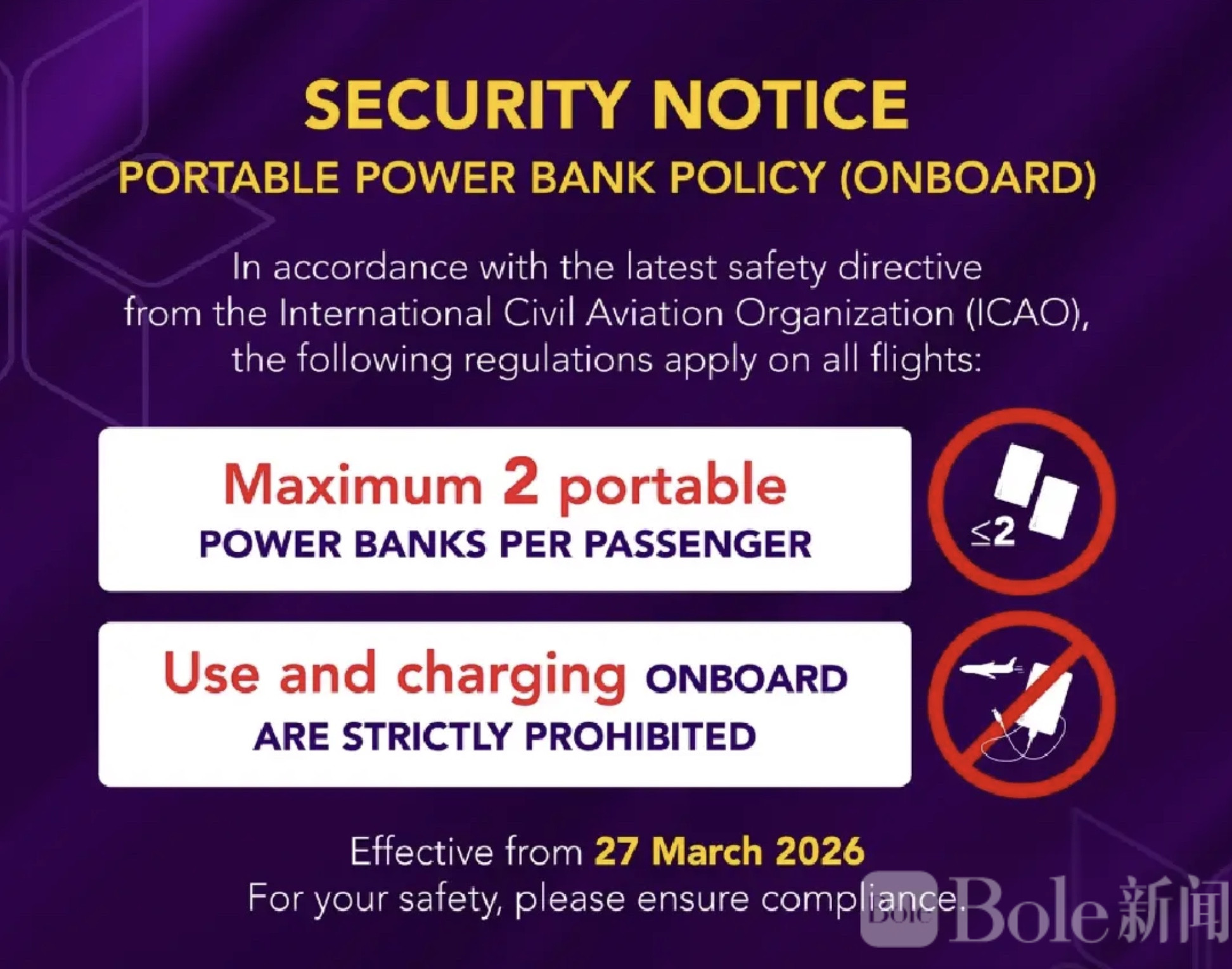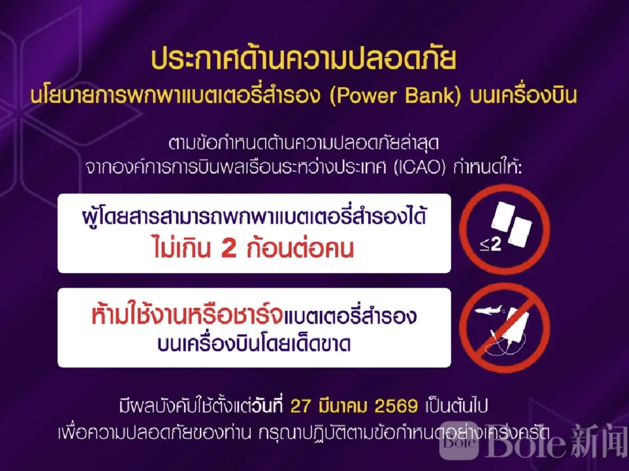 Bole新闻专讯:泰国国际航空公司(Thai Airways,简称“泰航”)4月3日通过官方Facebook账号发布最新安全公告,明确旅客携带充电宝(Power Bank)登机的新规定。此次措施遵循国际民航组织(ICAO)最新航空安全要求,旨在降低锂电池类产品在飞行中可能带来的风险,自2026年3月27日起正式生效。