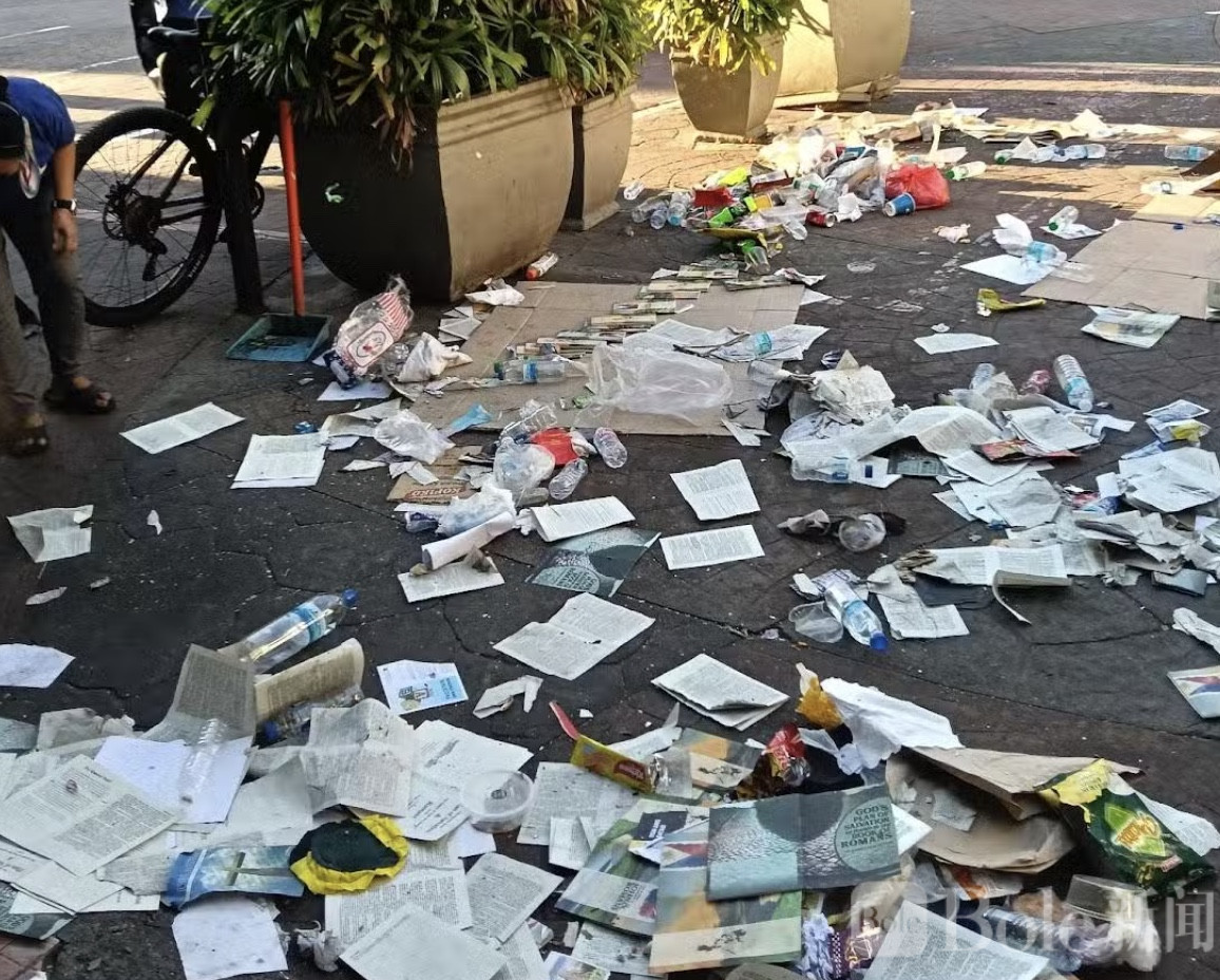 其实,在圣周假期到来之前,EcoWaste Coalition已经通过各种渠道呼吁信众“带走垃圾,只留下脚印”。可现实往往不那么理想。志愿者在现场看到,街道两侧、教堂入口甚至院内,都散落着大量塑料瓶、一次性餐盒和宣传单页,看上去多少有些刺眼。