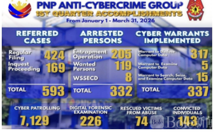 Bole新闻专讯:菲律宾国家警察反网络犯罪组(PNP-ACG)在2026年第一季度实施网络打击行动,共逮捕332名网络犯罪嫌疑人。行动期间,共执行337份网络搜查令,其中119人通过送达令状被捕,205人在诱捕行动中落网,另有8人在执行搜查、扣押及检查计算机数据过程中被捕。