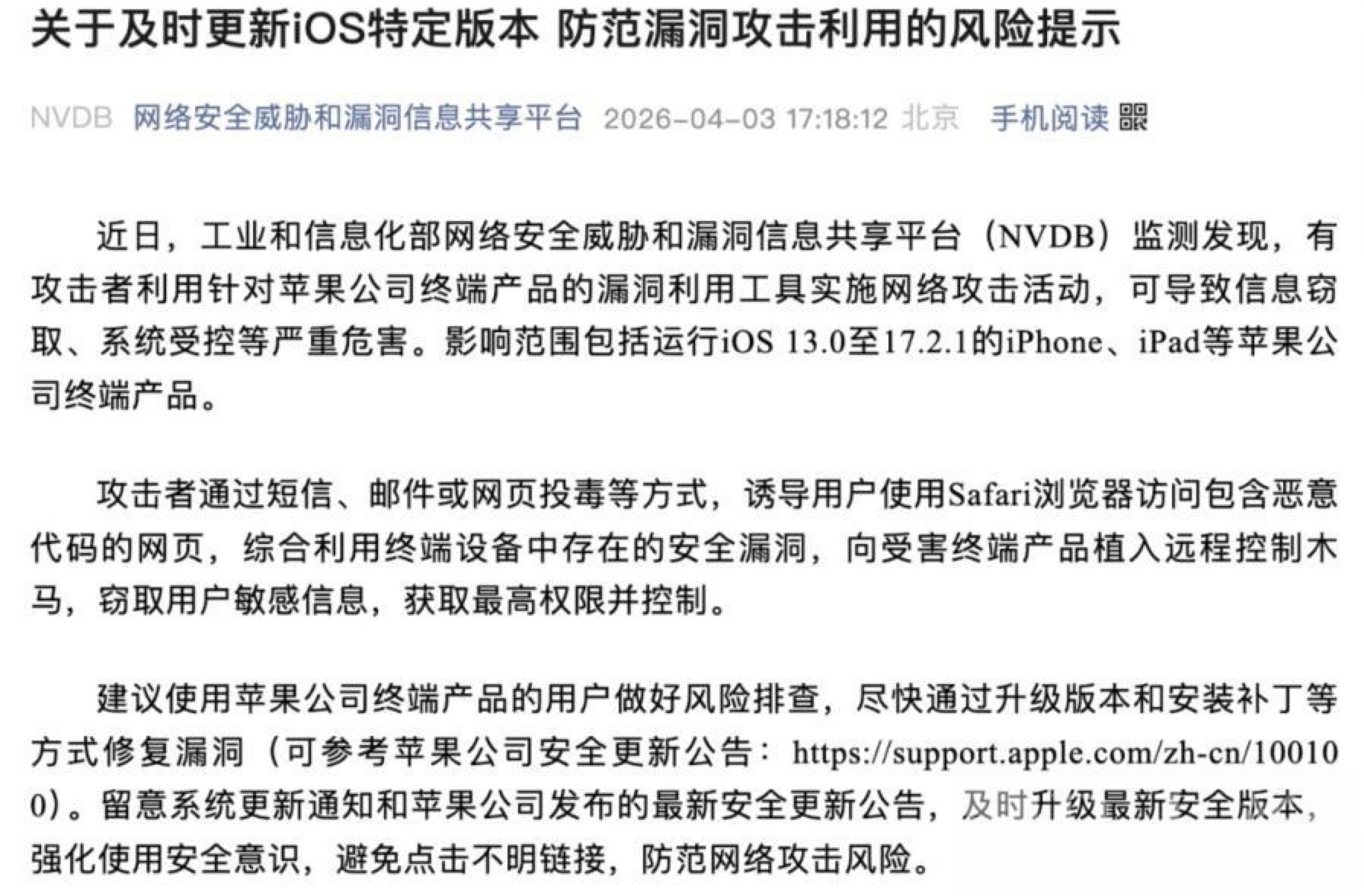 Bole新闻专讯:中国工业和信息化部网络安全威胁和漏洞信息共享平台(NVDB)近日发布重要提醒,发现有攻击者利用针对苹果终端设备的漏洞工具实施网络攻击,可能导致信息被窃取、系统受控等严重后果。