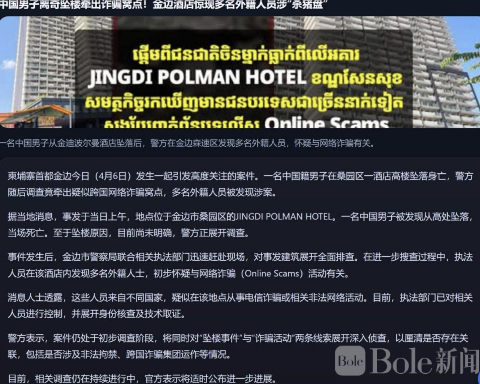 Bole新闻专讯:柬埔寨首都金边4月6日发生一起引发广泛关注的突发事件,一名中国籍男子在市区一酒店高楼坠落身亡,警方随即展开调查,并在同一地点发现疑似跨国网络诈骗窝点,多名外籍人员被当场控制。