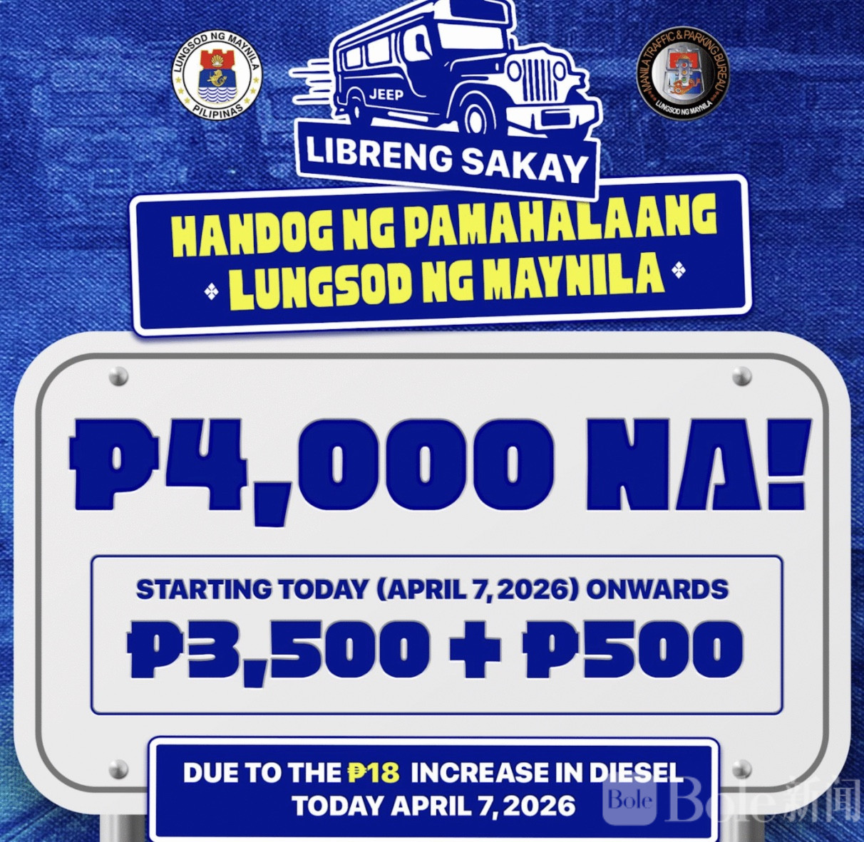 Bole新闻专讯:菲律宾马尼拉市政府宣布,为应对本周柴油价格从每升17比索涨至19比索,参与“Libreng Sakay”(免费乘车)计划的吉普尼司机每日补贴将从原本的3,500比索提升至4,000比索。