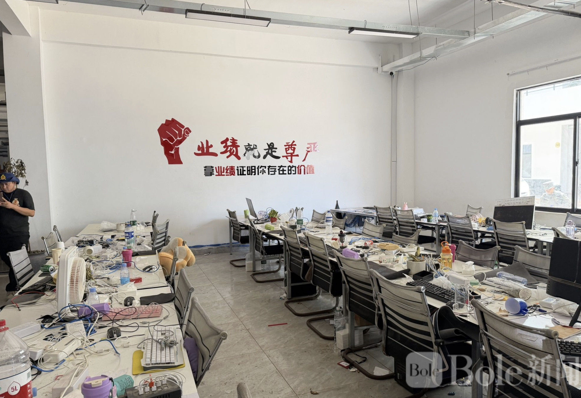 据悉,该电诈基地由超过160栋建筑组成,分为A至G区,其中E区主要用于国际诈骗,多为中资团伙操控。办公室从晚间9点至凌晨3点运作,配备办公桌、电脑及诈骗专用设备,且中央挂有红色胜利大鼓,犯罪分子据称在达成诈骗目标后敲鼓庆祝。办公室内还贴有中文励志标语,如“业绩就是尊严,拿业绩证明你存在的价值”,强化员工业绩压力。
