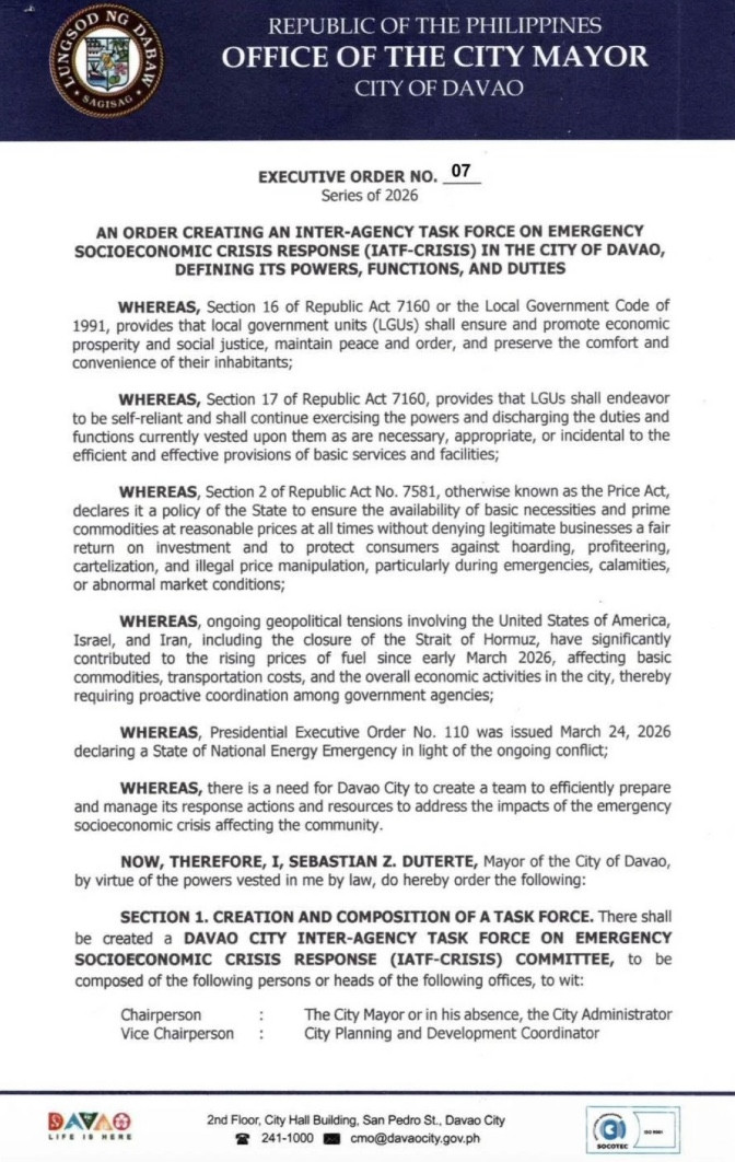 Bole新闻专讯:为了应对持续上涨的油价及其对基本生活用品和经济活动的影响,达沃市市长Sebastian Duterte于4月6日签署行政命令,成立市级跨部门紧急社会经济危机应对小组(IATF-Crisis)。这支小组旨在迅速协调政府资源,确保物价稳定、就业受保护,并维持基本服务的连续供应。